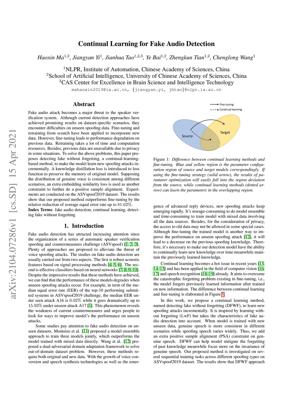 Fake audio attack becomes a major threat to the speaker verification system. Although current detection approaches have achieved promising results on dataset-specific scenarios, they encounter difficulties on unseen spoofing data. Fine-tuning and retraining from scratch have been applied to incorporate new data. However, fine-tuning leads to performance degradation on previous data. Retraining takes a lot of time and computation resources. Besides, previous data are unavailable due to privacy in some situations. To solve the above problems, this paper proposes detecting fake without forgetting, a continual-learning-based method, to make the model learn new spoofing attacks incrementally. A knowledge distillation loss is introduced to loss function to preserve the memory of original model. Supposing the distribution of genuine voice is consistent among different scenarios, an extra embedding similarity loss is used as another constraint to further do a positive sample alignment. Experiments are conducted on the ASVspoof2019 dataset. The results show that our proposed method outperforms fine-tuning by the relative reduction of average equal error rate up to 81.62%.