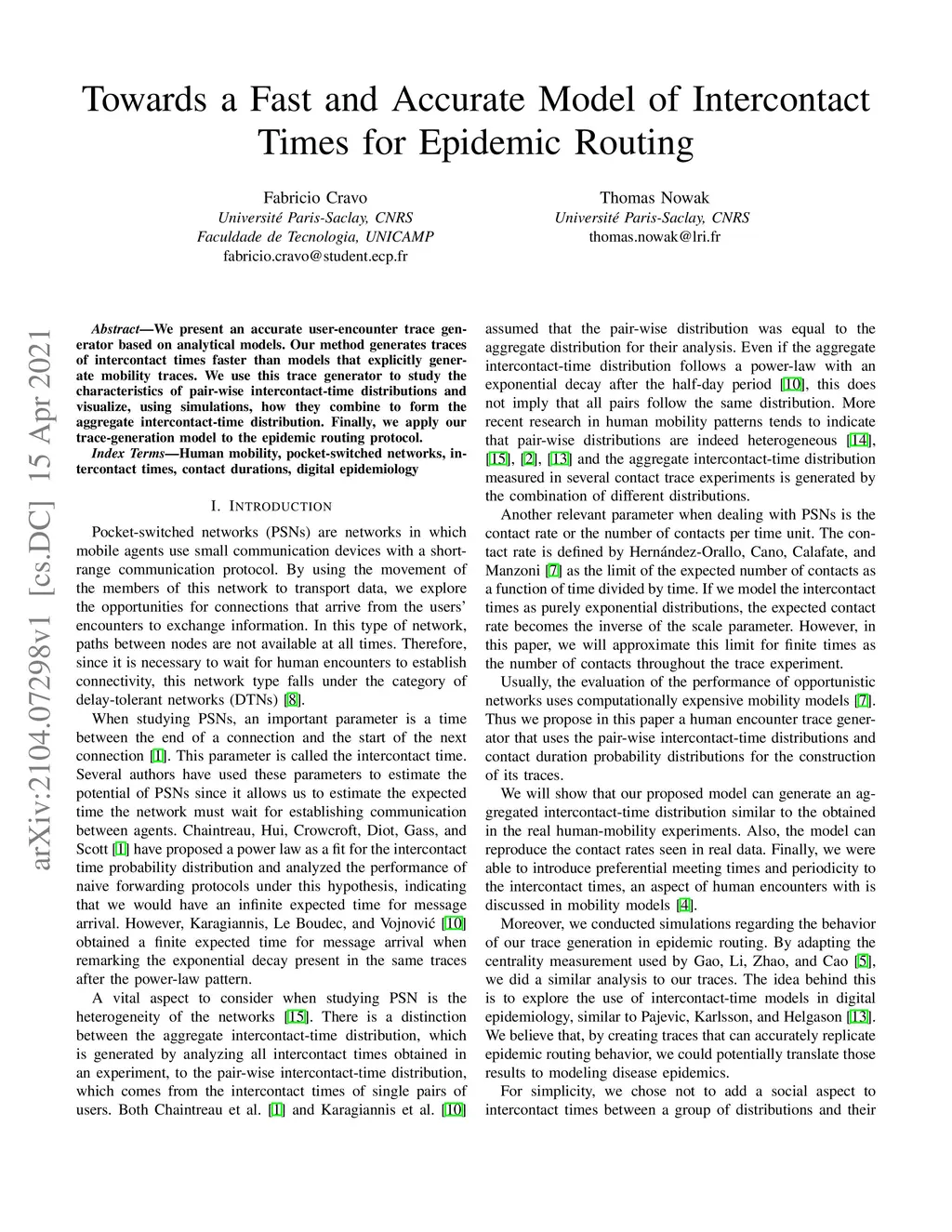 We present an accurate user-encounter trace generator based on analytical models. Our method generates traces of intercontact times faster than models that explicitly generate mobility traces. We use this trace generator to study the characteristics of pair-wise intercontact-time distributions and visualize, using simulations, how they combine to form the aggregate intercontact-time distribution. Finally, we apply our trace-generation model to the epidemic routing protocol.