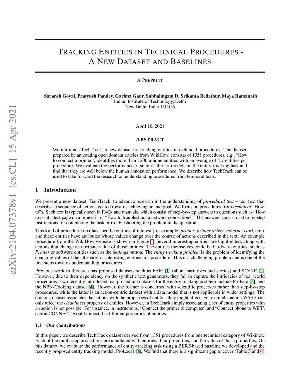 We introduce TechTrack, a new dataset for tracking entities in technical procedures. The dataset, prepared by annotating open domain articles from WikiHow, consists of 1351 procedures, e.g., "How to connect a printer", identifies more than 1200 unique entities with an average of 4.7 entities per procedure. We evaluate the performance of state-of-the-art models on the entity-tracking task and find that they are well below the human annotation performance. We describe how TechTrack can be used to take forward the research on understanding procedures from temporal texts.
