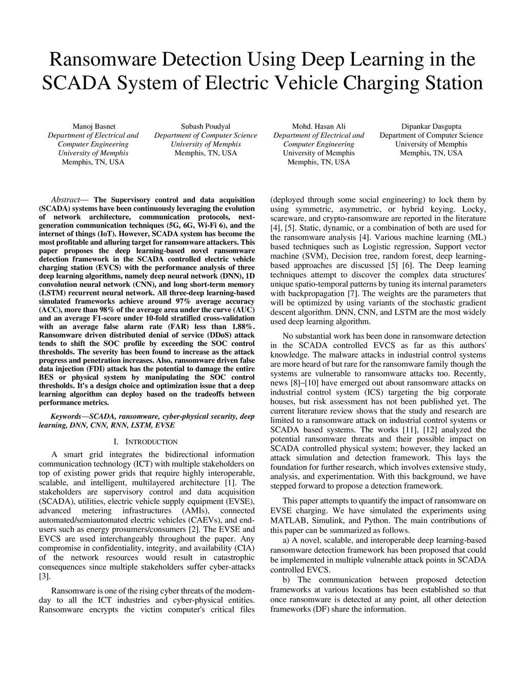 Ransomware Detection Using Deep Learning in the SCADA System of Electric