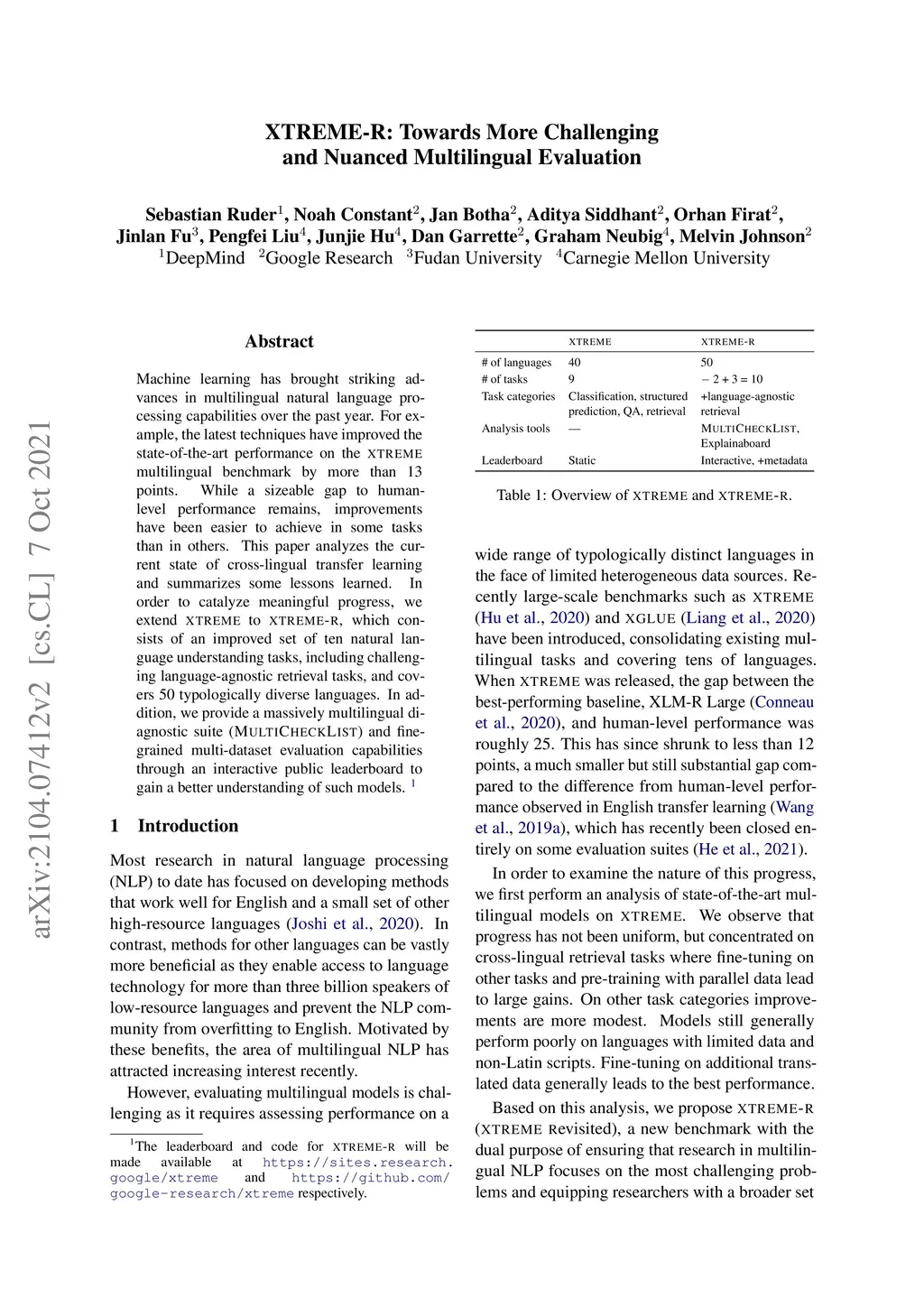 Machine learning has brought striking advances in multilingual natural language processing capabilities over the past year. For example, the latest techniques have improved the state-of-the-art performance on the XTREME multilingual benchmark by more than 13 points. While a sizeable gap to human-level performance remains, improvements have been easier to achieve in some tasks than in others. This paper analyzes the current state of cross-lingual transfer learning and summarizes some lessons learned. In order to catalyze meaningful progress, we extend XTREME to XTREME-R, which consists of an improved set of ten natural language understanding tasks, including challenging language-agnostic retrieval tasks, and covers 50 typologically diverse languages. In addition, we provide a massively multilingual diagnostic suite (MultiCheckList) and fine-grained multi-dataset evaluation capabilities through an interactive public leaderboard to gain a better understanding of such models. The leaderboard and code for XTREME-R will be made available at https://sites.research.google/xtreme and https://github.com/google-research/xtreme respectively.
