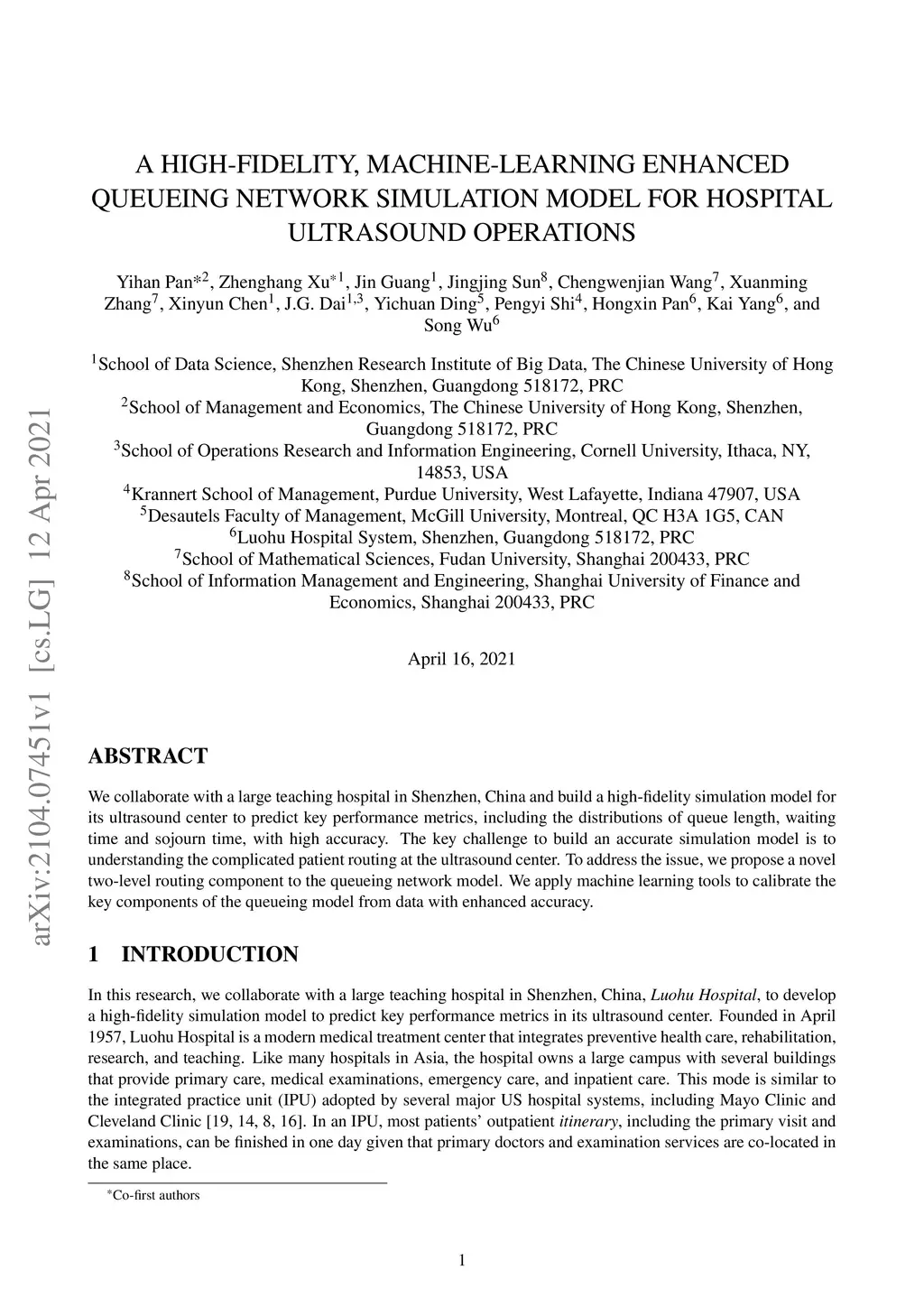 We collaborate with a large teaching hospital in Shenzhen, China and build a high-fidelity simulation model for its ultrasound center to predict key performance metrics, including the distributions of queue length, waiting time and sojourn time, with high accuracy. The key challenge to build an accurate simulation model is to understanding the complicated patient routing at the ultrasound center. To address the issue, we propose a novel two-level routing component to the queueing network model. We apply machine learning tools to calibrate the key components of the queueing model from data with enhanced accuracy.