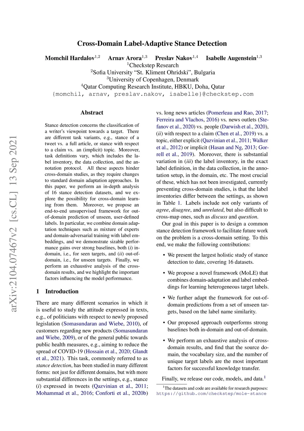 Stance detection concerns the classification of a writer's viewpoint towards a target. There are different task variants, e.g., stance of a tweet vs. a full article, or stance with respect to a claim vs. an (implicit) topic. Moreover, task definitions vary, which includes the label inventory, the data collection, and the annotation protocol. All these aspects hinder cross-domain studies, as they require changes to standard domain adaptation approaches. In this paper, we perform an in-depth analysis of 16 stance detection datasets, and we explore the possibility for cross-domain learning from them. Moreover, we propose an end-to-end unsupervised framework for out-of-domain prediction of unseen, user-defined labels. In particular, we combine domain adaptation techniques such as mixture of experts and domain-adversarial training with label embeddings, and we demonstrate sizable performance gains over strong baselines, both (i) in-domain, i.e., for seen targets, and (ii) out-of-domain, i.e., for unseen targets. Finally, we perform an exhaustive analysis of the cross-domain results, and we highlight the important factors influencing the model performance.