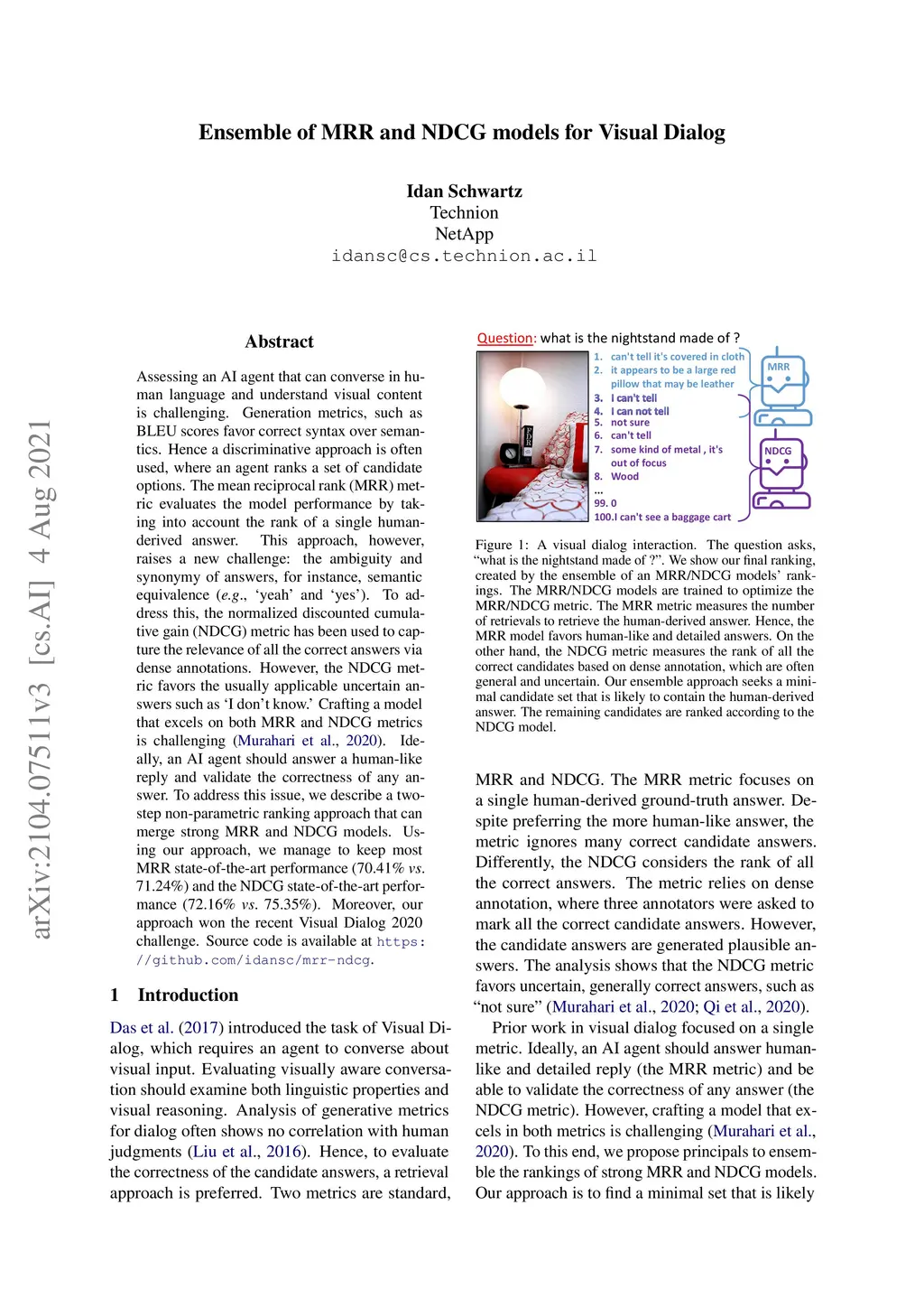 Assessing an AI agent that can converse in human language and understand visual content is challenging. Generation metrics, such as BLEU scores favor correct syntax over semantics. Hence a discriminative approach is often used, where an agent ranks a set of candidate options. The mean reciprocal rank (MRR) metric evaluates the model performance by taking into account the rank of a single human-derived answer. This approach, however, raises a new challenge: the ambiguity and synonymy of answers, for instance, semantic equivalence (e.g., `yeah' and `yes'). To address this, the normalized discounted cumulative gain (NDCG) metric has been used to capture the relevance of all the correct answers via dense annotations. However, the NDCG metric favors the usually applicable uncertain answers such as `I don't know. Crafting a model that excels on both MRR and NDCG metrics is challenging. Ideally, an AI agent should answer a human-like reply and validate the correctness of any answer. To address this issue, we describe a two-step non-parametric ranking approach that can merge strong MRR and NDCG models. Using our approach, we manage to keep most MRR state-of-the-art performance (70.41% vs. 71.24%) and the NDCG state-of-the-art performance (72.16% vs. 75.35%). Moreover, our approach won the recent Visual Dialog 2020 challenge. Source code is available at https://github.com/idansc/mrr-ndcg.