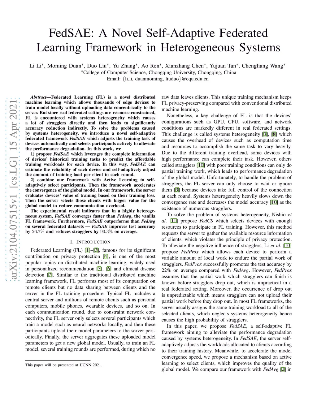 Federated Learning (FL) is a novel distributed machine learning which allows thousands of edge devices to train model locally without uploading data concentrically to the server. But since real federated settings are resource-constrained, FL is encountered with systems heterogeneity which causes a lot of stragglers directly and then leads to significantly accuracy reduction indirectly. To solve the problems caused by systems heterogeneity, we introduce a novel self-adaptive federated framework FedSAE which adjusts the training task of devices automatically and selects participants actively to alleviate the performance degradation. In this work, we 1) propose FedSAE which leverages the complete information of devices' historical training tasks to predict the affordable training workloads for each device. In this way, FedSAE can estimate the reliability of each device and self-adaptively adjust the amount of training load per client in each round. 2) combine our framework with Active Learning to self-adaptively select participants. Then the framework accelerates the convergence of the global model. In our framework, the server evaluates devices' value of training based on their training loss. Then the server selects those clients with bigger value for the global model to reduce communication overhead. The experimental result indicates that in a highly heterogeneous system, FedSAE converges faster than FedAvg, the vanilla FL framework. Furthermore, FedSAE outperforms than FedAvg on several federated datasets - FedSAE improves test accuracy by 26.7% and reduces stragglers by 90.3% on average.