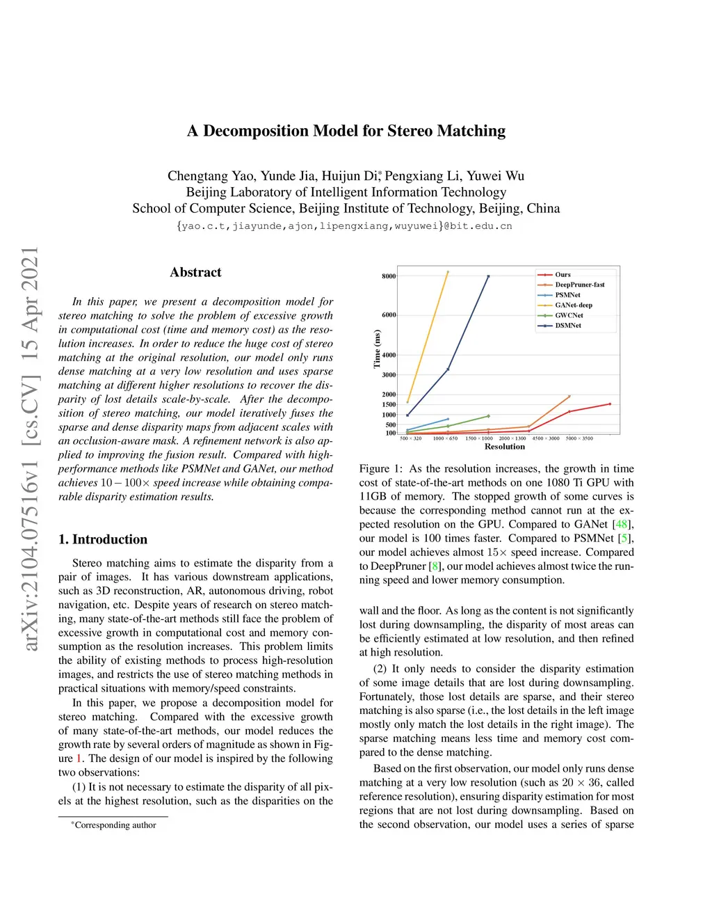In this paper, we present a decomposition model for stereo matching to solve the problem of excessive growth in computational cost (time and memory cost) as the resolution increases. In order to reduce the huge cost of stereo matching at the original resolution, our model only runs dense matching at a very low resolution and uses sparse matching at different higher resolutions to recover the disparity of lost details scale-by-scale. After the decomposition of stereo matching, our model iteratively fuses the sparse and dense disparity maps from adjacent scales with an occlusion-aware mask. A refinement network is also applied to improving the fusion result. Compared with high-performance methods like PSMNet and GANet, our method achieves speed increase while obtaining comparable disparity estimation results.