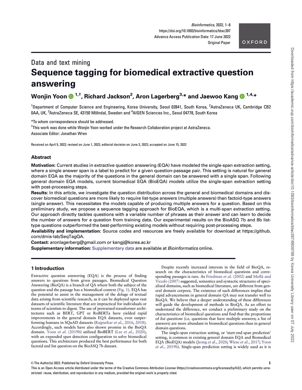 Sequence tagging for biomedical extractive question answering