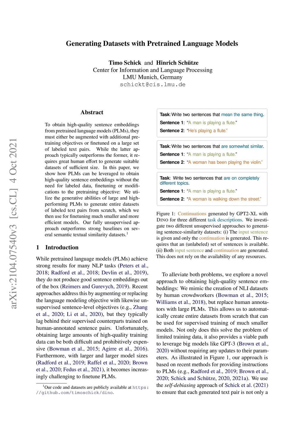 To obtain high-quality sentence embeddings from pretrained language models (PLMs), they must either be augmented with additional pretraining objectives or finetuned on a large set of labeled text pairs. While the latter approach typically outperforms the former, it requires great human effort to generate suitable datasets of sufficient size. In this paper, we show how PLMs can be leveraged to obtain high-quality sentence embeddings without the need for labeled data, finetuning or modifications to the pretraining objective: We utilize the generative abilities of large and high-performing PLMs to generate entire datasets of labeled text pairs from scratch, which we then use for finetuning much smaller and more efficient models. Our fully unsupervised approach outperforms strong baselines on several semantic textual similarity datasets.