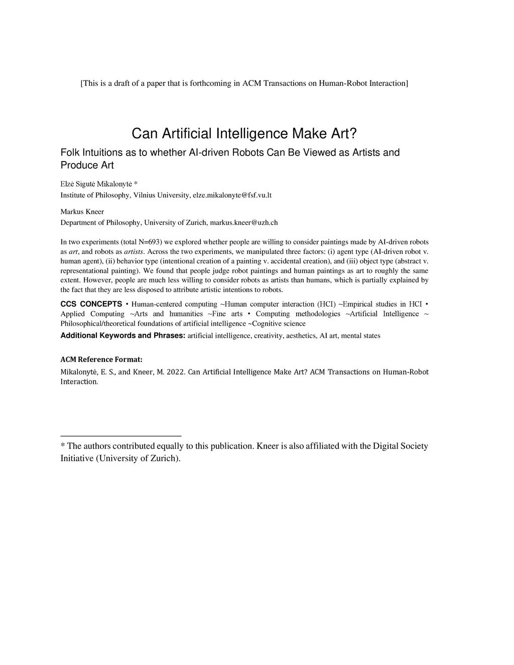 In two experiments (total N=693) we explored whether people are willing to consider paintings made by AI-driven robots as art, and robots as artists. Across the two experiments, we manipulated three factors: (i) agent type (AI-driven robot v. human agent), (ii) behavior type (intentional creation of a painting v. accidental creation), and (iii) object type (abstract v. representational painting). We found that people judge robot paintings and human painting as art to roughly the same extent. However, people are much less willing to consider robots as artists than humans, which is partially explained by the fact that they are less disposed to attribute artistic intentions to robots.