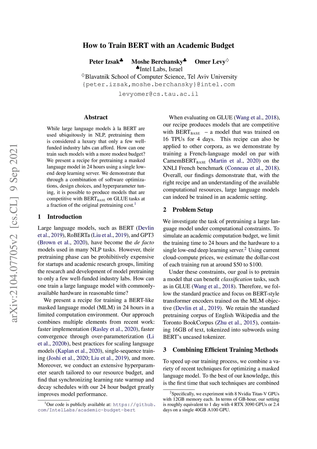 While large language models a la BERT are used ubiquitously in NLP, pretraining them is considered a luxury that only a few well-funded industry labs can afford. How can one train such models with a more modest budget? We present a recipe for pretraining a masked language model in 24 hours using a single low-end deep learning server. We demonstrate that through a combination of software optimizations, design choices, and hyperparameter tuning, it is possible to produce models that are competitive with BERT-base on GLUE tasks at a fraction of the original pretraining cost.