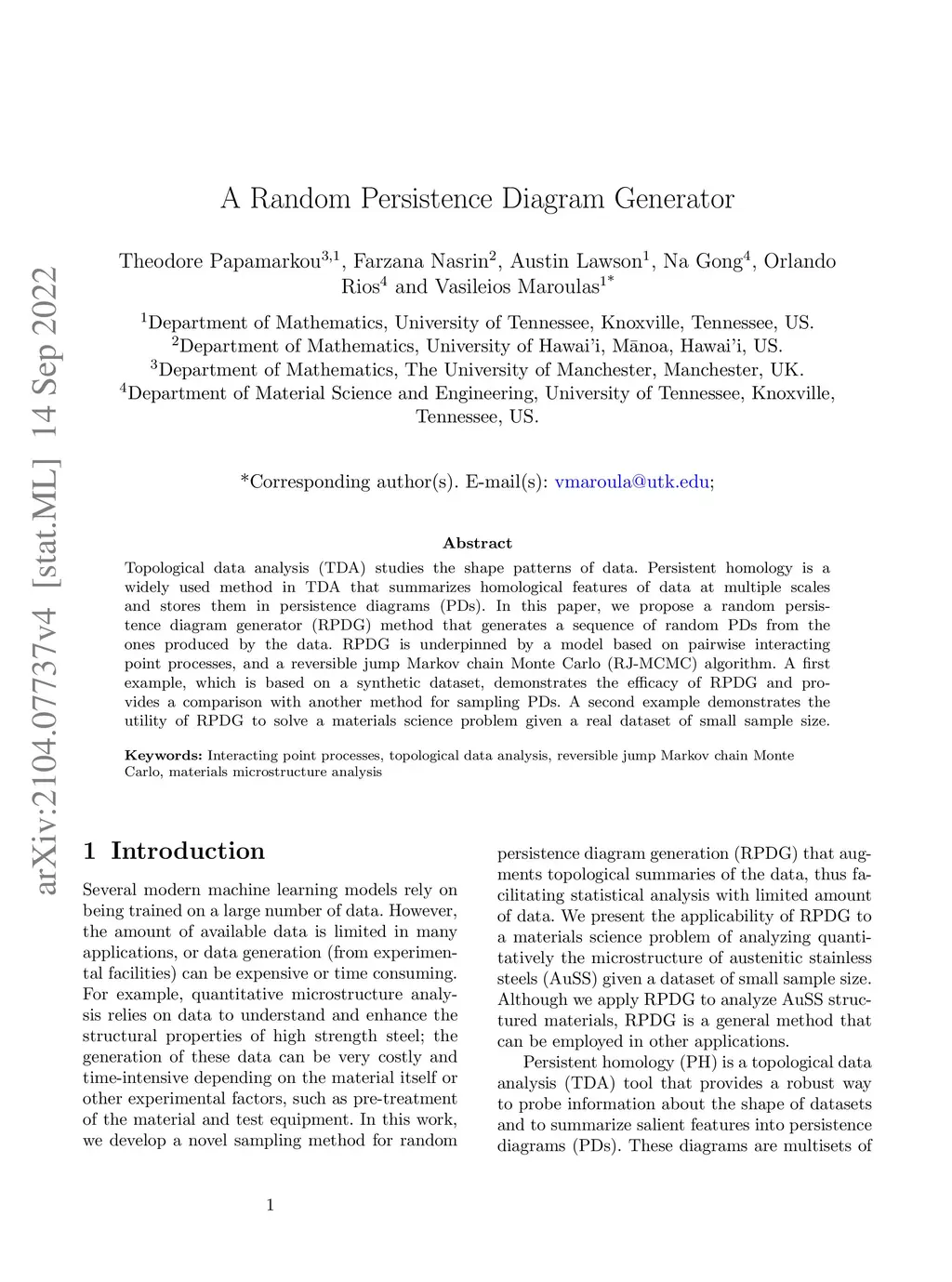 Topological data analysis (TDA) studies the shape patterns of data. Persistent homology (PH) is a widely used method in TDA that summarizes homological features of data at multiple scales and stores this in persistence diagrams (PDs). As TDA is commonly used in the analysis of high dimensional data sets, a sufficiently large amount of PDs that allow performing statistical analysis is typically unavailable or requires inordinate computational resources. In this paper, we propose random persistence diagram generation (RPDG), a method that generates a sequence of random PDs from the ones produced by the data. RPDG is underpinned (i) by a parametric model based on pairwise interacting point processes for inference of persistence diagrams and (ii) by a reversible jump Markov chain Monte Carlo (RJ-MCMC) algorithm for generating samples of PDs. The parametric model combines a Dirichlet partition to capture spatial homogeneity of the location of points in a PD and a step function to capture the pairwise interaction between them. The RJ-MCMC algorithm incorporates trans-dimensional addition and removal of points and same-dimensional relocation of points across samples of PDs. The efficacy of RPDG is demonstrated via an example and a detailed comparison with other existing methods is presented.