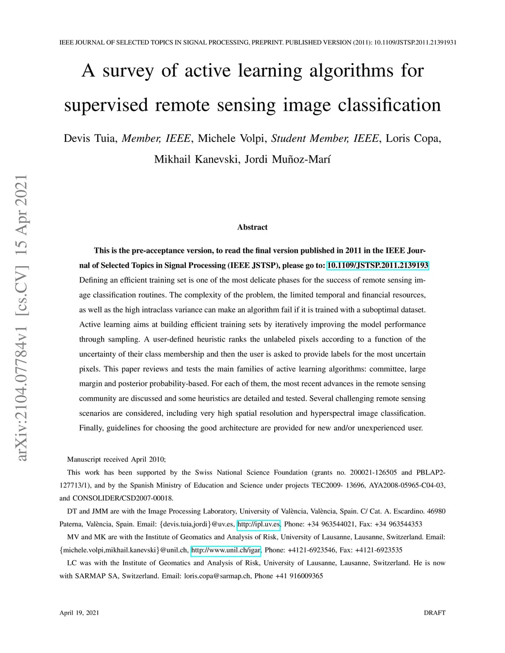 Defining an efficient training set is one of the most delicate phases for the success of remote sensing image classification routines. The complexity of the problem, the limited temporal and financial resources, as well as the high intraclass variance can make an algorithm fail if it is trained with a suboptimal dataset. Active learning aims at building efficient training sets by iteratively improving the model performance through sampling. A user-defined heuristic ranks the unlabeled pixels according to a function of the uncertainty of their class membership and then the user is asked to provide labels for the most uncertain pixels. This paper reviews and tests the main families of active learning algorithms: committee, large margin and posterior probability-based. For each of them, the most recent advances in the remote sensing community are discussed and some heuristics are detailed and tested. Several challenging remote sensing scenarios are considered, including very high spatial resolution and hyperspectral image classification. Finally, guidelines for choosing the good architecture are provided for new and/or unexperienced user.