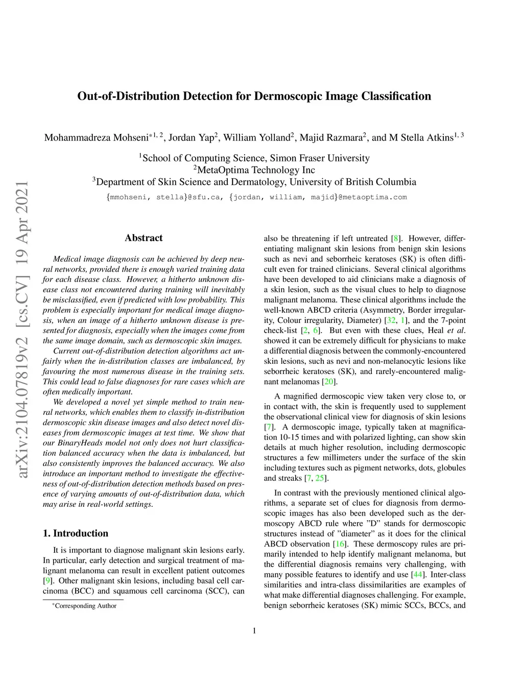 Medical image diagnosis can be achieved by deep neural networks, provided there is enough varied training data for each disease class. However, a hitherto unknown disease class not encountered during training will inevitably be misclassified, even if predicted with low probability. This problem is especially important for medical image diagnosis, when an image of a hitherto unknown disease is presented for diagnosis, especially when the images come from the same image domain, such as dermoscopic skin images. Current out-of-distribution detection algorithms act unfairly when the in-distribution classes are imbalanced, by favouring the most numerous disease in the training sets. This could lead to false diagnoses for rare cases which are often medically important. We developed a novel yet simple method to train neural networks, which enables them to classify in-distribution dermoscopic skin disease images and also detect novel diseases from dermoscopic images at test time. We show that our BinaryHeads model not only does not hurt classification balanced accuracy when the data is imbalanced, but also consistently improves the balanced accuracy. We also introduce an important method to investigate the effectiveness of out-of-distribution detection methods based on presence of varying amounts of out-of-distribution data, which may arise in real-world settings.