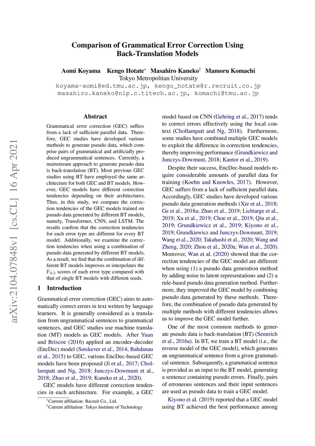 Comparison of Grammatical Error Correction Using Back-Translation Models