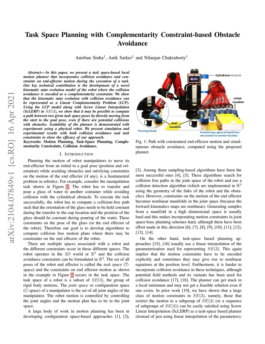 In this paper, we present a task space-based local motion planner that incorporates collision avoidance and constraints on end-effector motion during the execution of a task. Our key technical contribution is the development of a novel kinematic state evolution model of the robot where the collision avoidance is encoded as a complementarity constraint. We show that the kinematic state evolution with collision avoidance can be represented as a Linear Complementarity Problem (LCP). Using the LCP model along with Screw Linear Interpolation (ScLERP) in SE(3), we show that it may be possible to compute a path between two given task space poses by directly moving from the start to the goal pose, even if there are potential collisions with obstacles. The scalability of the planner is demonstrated with experiments using a physical robot. We present simulation and experimental results with both collision avoidance and task constraints to show the efficacy of our approach.
