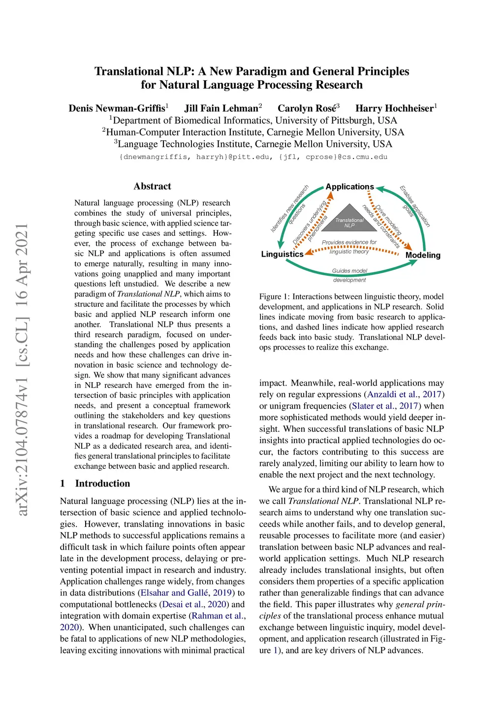 Natural language processing (NLP) research combines the study of universal principles, through basic science, with applied science targeting specific use cases and settings. However, the process of exchange between basic NLP and applications is often assumed to emerge naturally, resulting in many innovations going unapplied and many important questions left unstudied. We describe a new paradigm of Translational NLP, which aims to structure and facilitate the processes by which basic and applied NLP research inform one another. Translational NLP thus presents a third research paradigm, focused on understanding the challenges posed by application needs and how these challenges can drive innovation in basic science and technology design. We show that many significant advances in NLP research have emerged from the intersection of basic principles with application needs, and present a conceptual framework outlining the stakeholders and key questions in translational research. Our framework provides a roadmap for developing Translational NLP as a dedicated research area, and identifies general translational principles to facilitate exchange between basic and applied research.