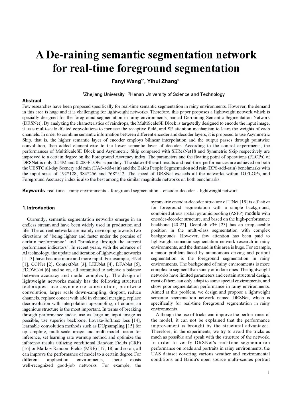 Few researches have been proposed specifically for real-time semantic segmentation in rainy environments. However, the demand in this area is huge and it is challenging for lightweight networks. Therefore, this paper proposes a lightweight network which is specially designed for the foreground segmentation in rainy environments, named De-raining Semantic Segmentation Network (DRSNet). By analyzing the characteristics of raindrops, the MultiScaleSE Block is targetedly designed to encode the input image, it uses multi-scale dilated convolutions to increase the receptive field, and SE attention mechanism to learn the weights of each channels. In order to combine semantic information between different encoder and decoder layers, it is proposed to use Asymmetric Skip, that is, the higher semantic layer of encoder employs bilinear interpolation and the output passes through pointwise convolution, then added element-wise to the lower semantic layer of decoder. According to the control experiments, the performances of MultiScaleSE Block and Asymmetric Skip compared with SEResNet18 and Symmetric Skip respectively are improved to a certain degree on the Foreground Accuracy index. The parameters and the floating point of operations (FLOPs) of DRSNet is only 0.54M and 0.20GFLOPs separately. The state-of-the-art results and real-time performances are achieved on both the UESTC all-day Scenery add rain (UAS-add-rain) and the Baidu People Segmentation add rain (BPS-add-rain) benchmarks with the input sizes of 192*128, 384*256 and 768*512. The speed of DRSNet exceeds all the networks within 1GFLOPs, and Foreground Accuracy index is also the best among the similar magnitude networks on both benchmarks.