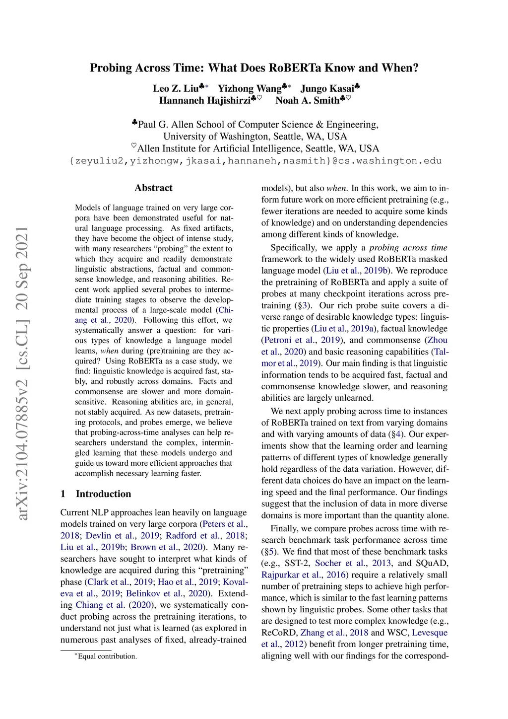 Probing Across Time: What Does RoBERTa Know and When?