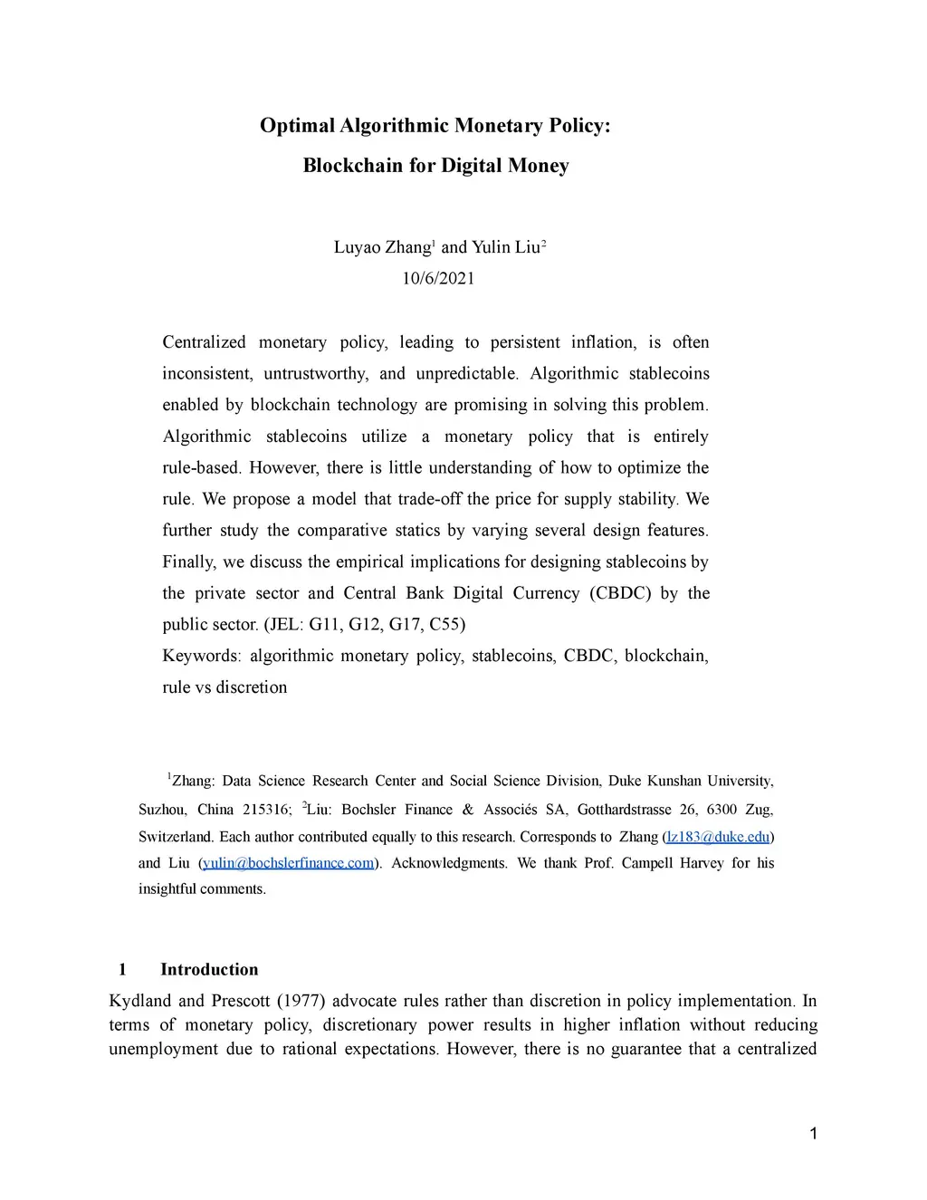 Centralized monetary policy, leading to persistent inflation, is often inconsistent, untrustworthy, and unpredictable. Algorithmic stablecoins enabled by blockchain technology are promising in solving this problem. Algorithmic stablecoins utilize a monetary policy that is entirely rule-based. However, there is little understanding of how to optimize the rule. We propose a model that trade-off the price for supply stability. We further study the comparative statics by varying several design features. Finally, we discuss the empirical implications for designing stablecoins by the private sector and Central Bank Digital Currency (CBDC) by the public sector.