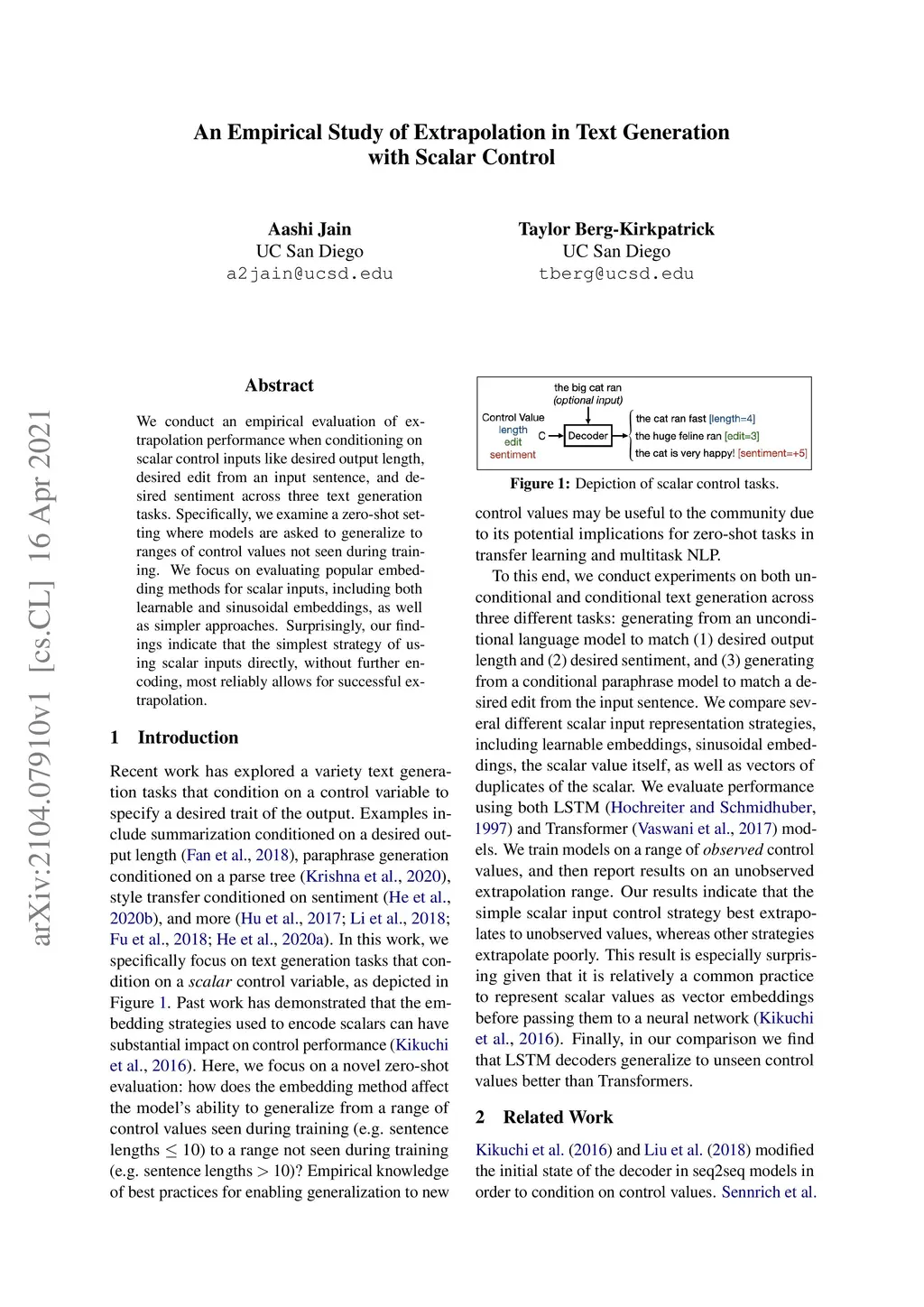 We conduct an empirical evaluation of extrapolation performance when conditioning on scalar control inputs like desired output length, desired edit from an input sentence, and desired sentiment across three text generation tasks. Specifically, we examine a zero-shot setting where models are asked to generalize to ranges of control values not seen during training. We focus on evaluating popular embedding methods for scalar inputs, including both learnable and sinusoidal embeddings, as well as simpler approaches. Surprisingly, our findings indicate that the simplest strategy of using scalar inputs directly, without further encoding, most reliably allows for successful extrapolation.