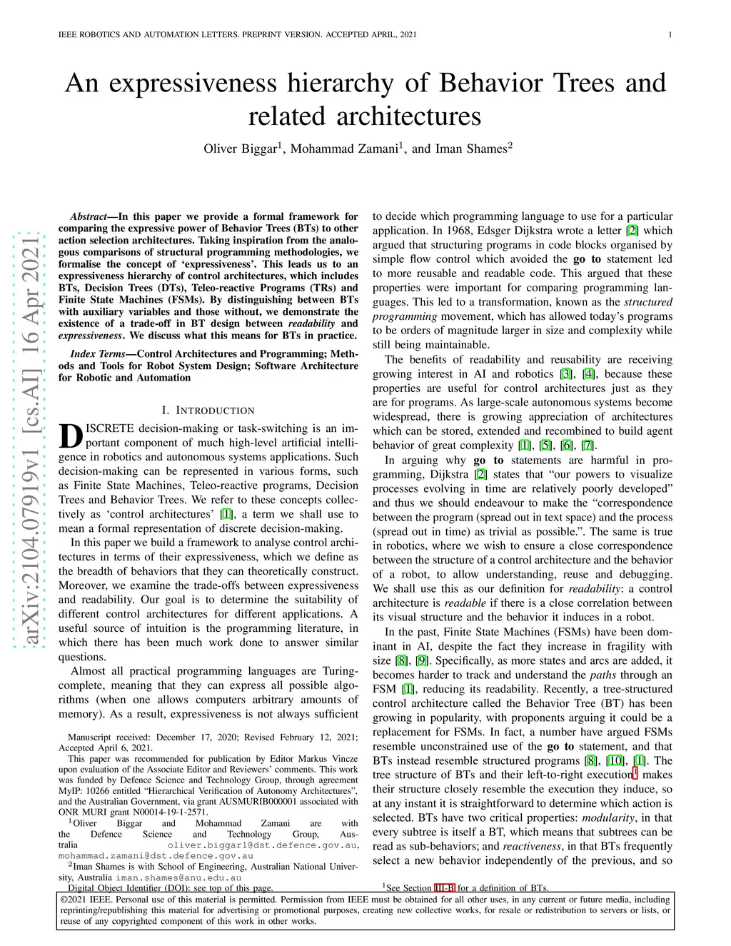 In this paper we provide a formal framework for comparing the expressive power of Behavior Trees (BTs) to other action selection architectures. Taking inspiration from the analogous comparisons of structural programming methodologies, we formalise the concept of `expressiveness'. This leads us to an expressiveness hierarchy of control architectures, which includes BTs, Decision Trees (DTs), Teleo-reactive Programs (TRs) and Finite State Machines (FSMs). By distinguishing between BTs with auxiliary variables and those without, we demonstrate the existence of a trade-off in BT design between readability and expressiveness. We discuss what this means for BTs in practice.