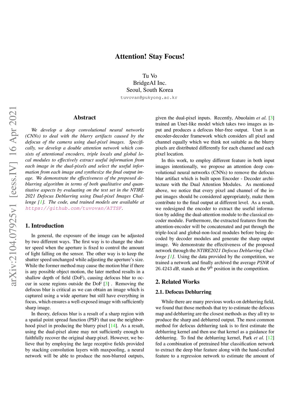 We develop a deep convolutional neural networks(CNNs) to deal with the blurry artifacts caused by the defocus of the camera using dual-pixel images. Specifically, we develop a double attention network which consists of attentional encoders, triple locals and global local modules to effectively extract useful information from each image in the dual-pixels and select the useful information from each image and synthesize the final output image. We demonstrate the effectiveness of the proposed deblurring algorithm in terms of both qualitative and quantitative aspects by evaluating on the test set in the NTIRE 2021 Defocus Deblurring using Dual-pixel Images Challenge. The code, and trained models are available at https://github.com/tuvovan/ATTSF.