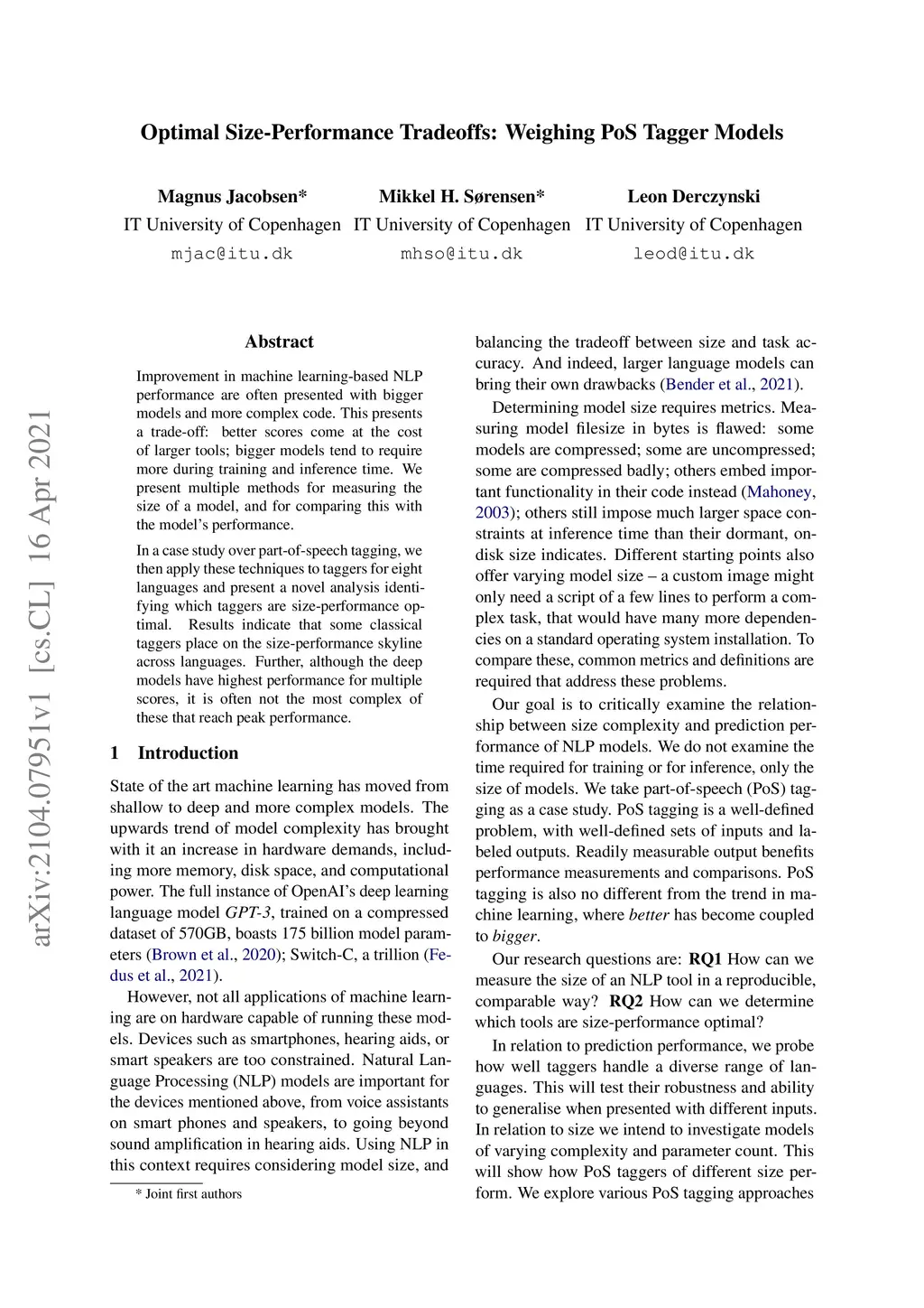 Improvement in machine learning-based NLP performance are often presented with bigger models and more complex code. This presents a trade-off: better scores come at the cost of larger tools; bigger models tend to require more during training and inference time. We present multiple methods for measuring the size of a model, and for comparing this with the model's performance. In a case study over part-of-speech tagging, we then apply these techniques to taggers for eight languages and present a novel analysis identifying which taggers are size-performance optimal. Results indicate that some classical taggers place on the size-performance skyline across languages. Further, although the deep models have highest performance for multiple scores, it is often not the most complex of these that reach peak performance.