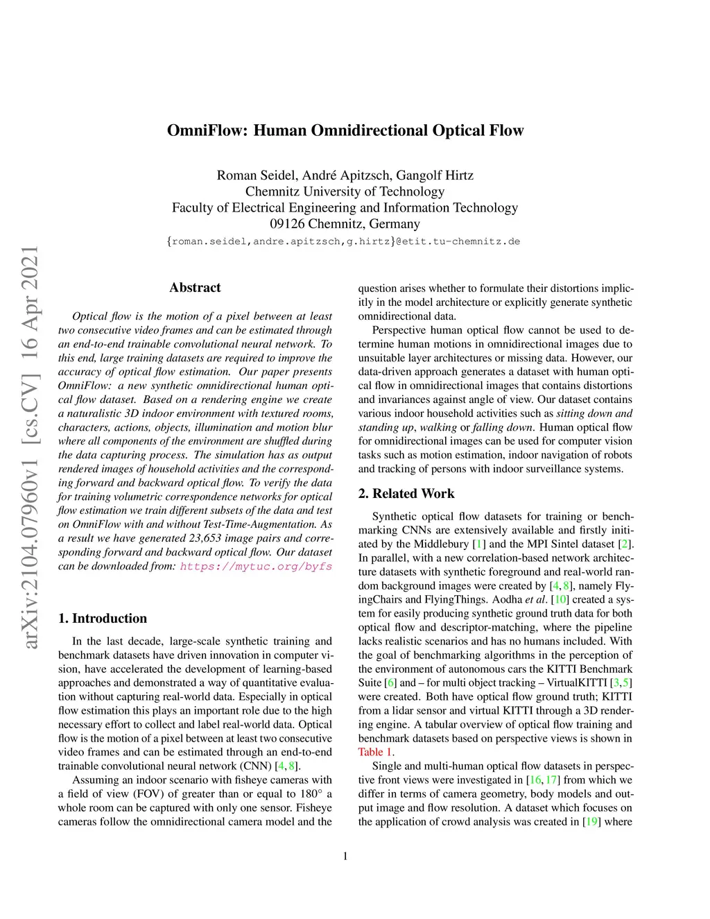 Optical flow is the motion of a pixel between at least two consecutive video frames and can be estimated through an end-to-end trainable convolutional neural network. To this end, large training datasets are required to improve the accuracy of optical flow estimation. Our paper presents OmniFlow: a new synthetic omnidirectional human optical flow dataset. Based on a rendering engine we create a naturalistic 3D indoor environment with textured rooms, characters, actions, objects, illumination and motion blur where all components of the environment are shuffled during the data capturing process. The simulation has as output rendered images of household activities and the corresponding forward and backward optical flow. To verify the data for training volumetric correspondence networks for optical flow estimation we train different subsets of the data and test on OmniFlow with and without Test-Time-Augmentation. As a result we have generated 23,653 image pairs and corresponding forward and backward optical flow. Our dataset can be downloaded from: https://mytuc.org/byfs