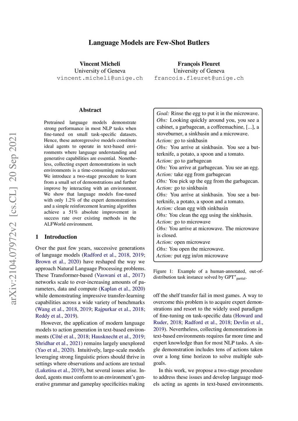 Pretrained language models demonstrate strong performance in most NLP tasks when fine-tuned on small task-specific datasets. Hence, these autoregressive models constitute ideal agents to operate in text-based environments where language understanding and generative capabilities are essential. Nonetheless, collecting expert demonstrations in such environments is a time-consuming endeavour. We introduce a two-stage procedure to learn from a small set of demonstrations and further improve by interacting with an environment. We show that language models fine-tuned with only 1.2% of the expert demonstrations and a simple reinforcement learning algorithm achieve a 51% absolute improvement in success rate over existing methods in the ALFWorld environment.