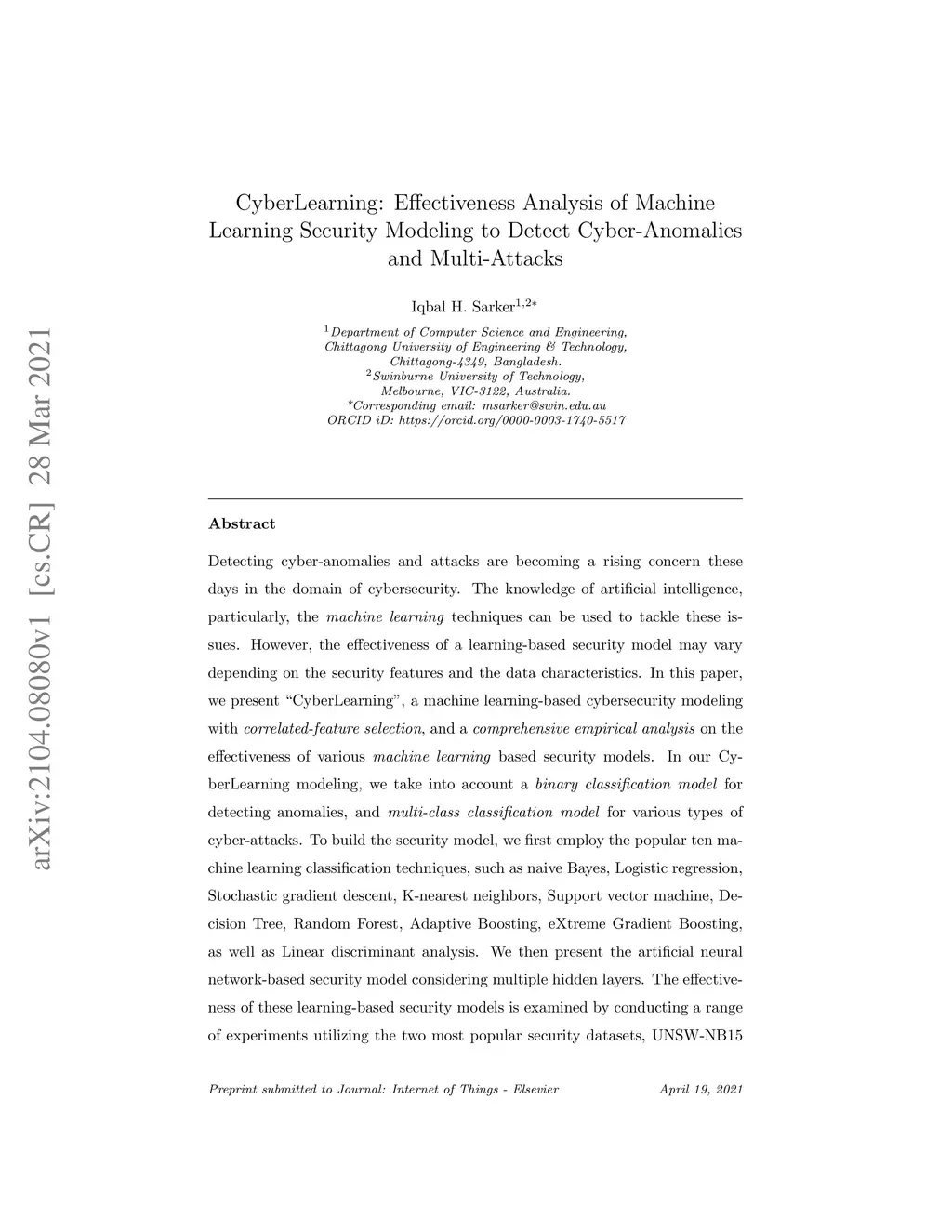 Detecting cyber-anomalies and attacks are becoming a rising concern these days in the domain of cybersecurity. The knowledge of artificial intelligence, particularly, the machine learning techniques can be used to tackle these issues. However, the effectiveness of a learning-based security model may vary depending on the security features and the data characteristics. In this paper, we present "CyberLearning", a machine learning-based cybersecurity modeling with correlated-feature selection, and a comprehensive empirical analysis on the effectiveness of various machine learning based security models. In our CyberLearning modeling, we take into account a binary classification model for detecting anomalies, and multi-class classification model for various types of cyber-attacks. To build the security model, we first employ the popular ten machine learning classification techniques, such as naive Bayes, Logistic regression, Stochastic gradient descent, K-nearest neighbors, Support vector machine, Decision Tree, Random Forest, Adaptive Boosting, eXtreme Gradient Boosting, as well as Linear discriminant analysis. We then present the artificial neural network-based security model considering multiple hidden layers. The effectiveness of these learning-based security models is examined by conducting a range of experiments utilizing the two most popular security datasets, UNSW-NB15 and NSL-KDD. Overall, this paper aims to serve as a reference point for data-driven security modeling through our experimental analysis and findings in the context of cybersecurity.