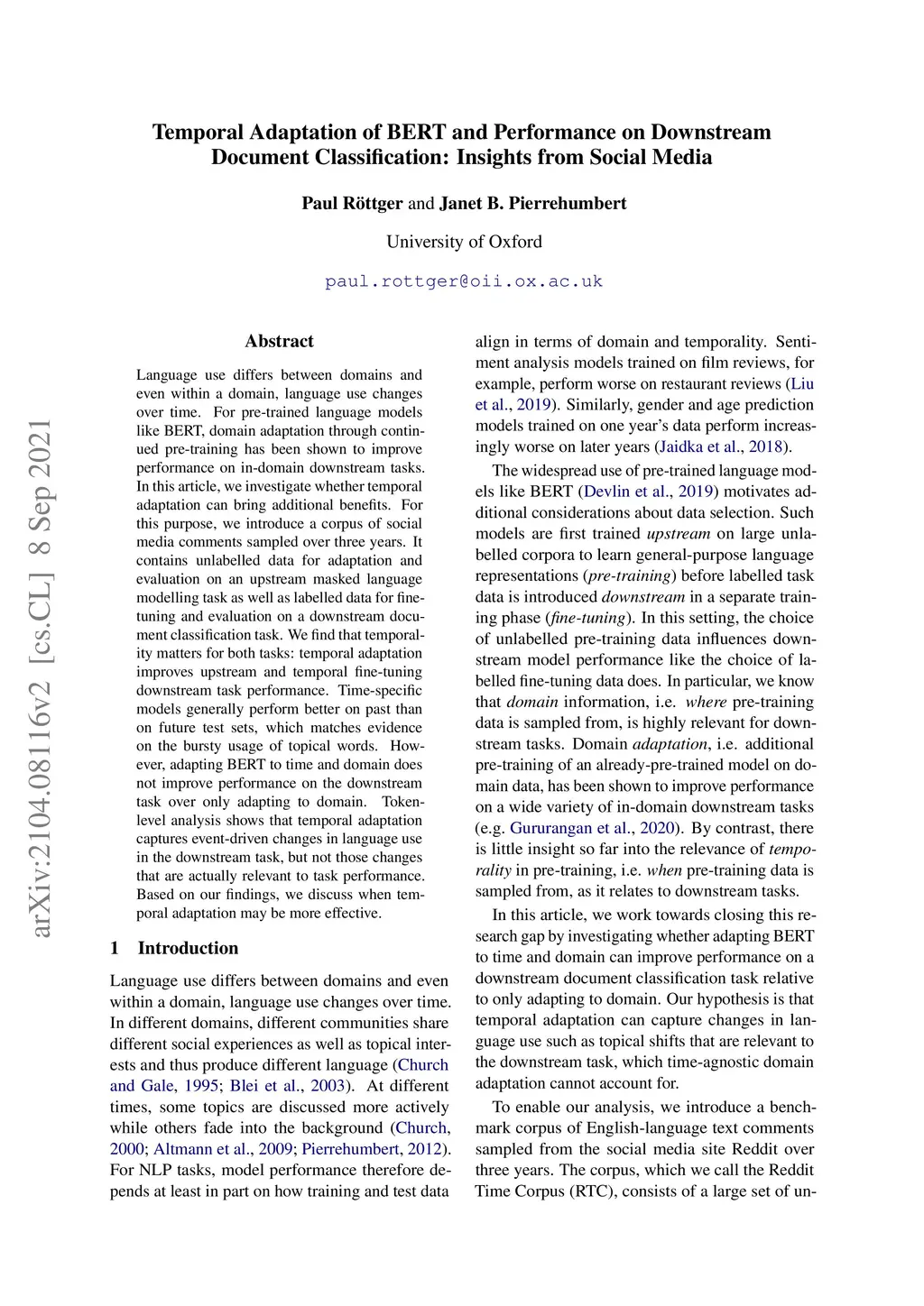 Temporal Adaptation of BERT and Performance on Downstream Document