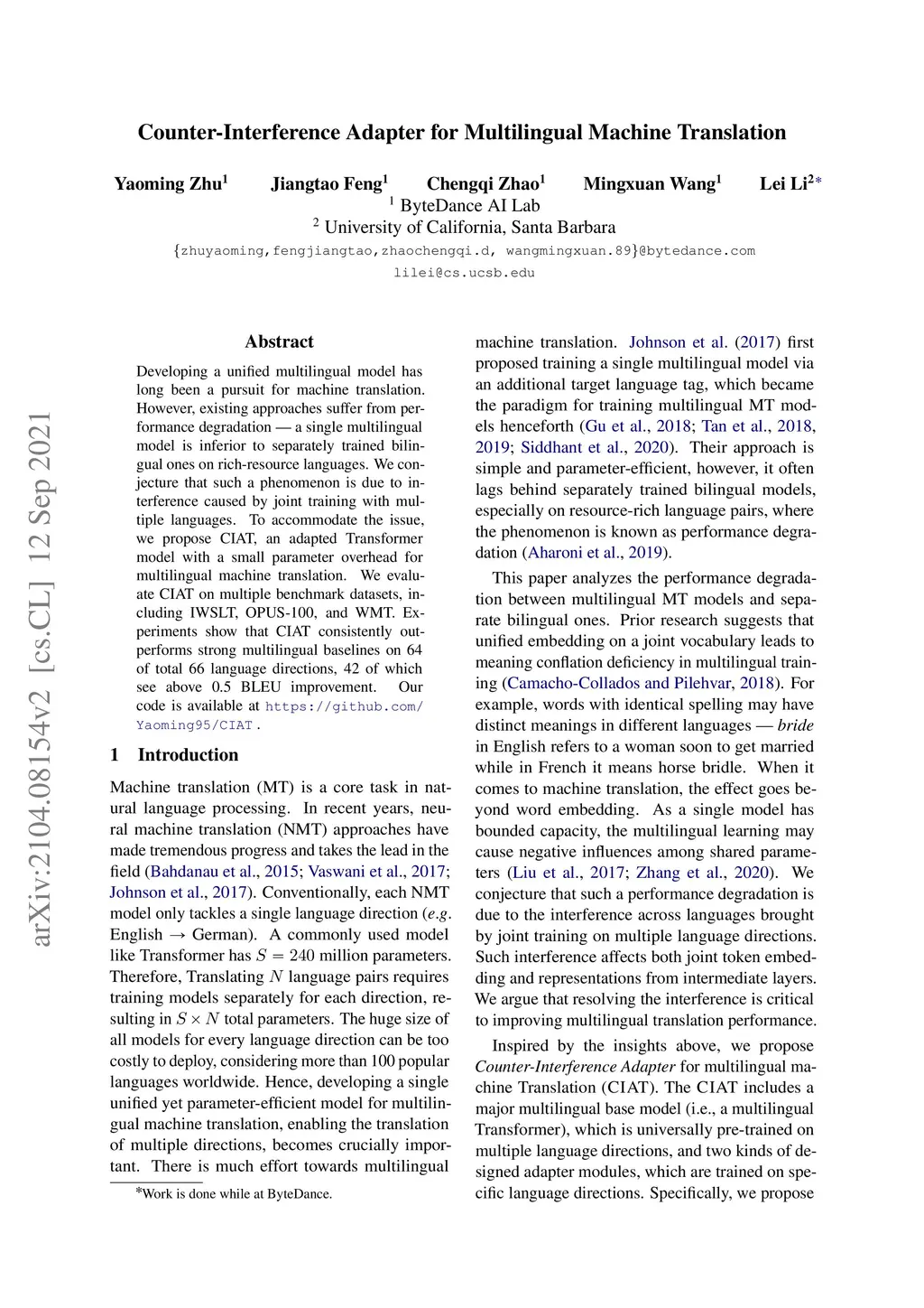 Developing a unified multilingual model has long been a pursuit for machine translation. However, existing approaches suffer from performance degradation -- a single multilingual model is inferior to separately trained bilingual ones on rich-resource languages. We conjecture that such a phenomenon is due to interference caused by joint training with multiple languages. To accommodate the issue, we propose CIAT, an adapted Transformer model with a small parameter overhead for multilingual machine translation. We evaluate CIAT on multiple benchmark datasets, including IWSLT, OPUS-100, and WMT. Experiments show that CIAT consistently outperforms strong multilingual baselines on 64 of total 66 language directions, 42 of which see above 0.5 BLEU improvement. Our code is available at \url{https://github.com/Yaoming95/CIAT}~.