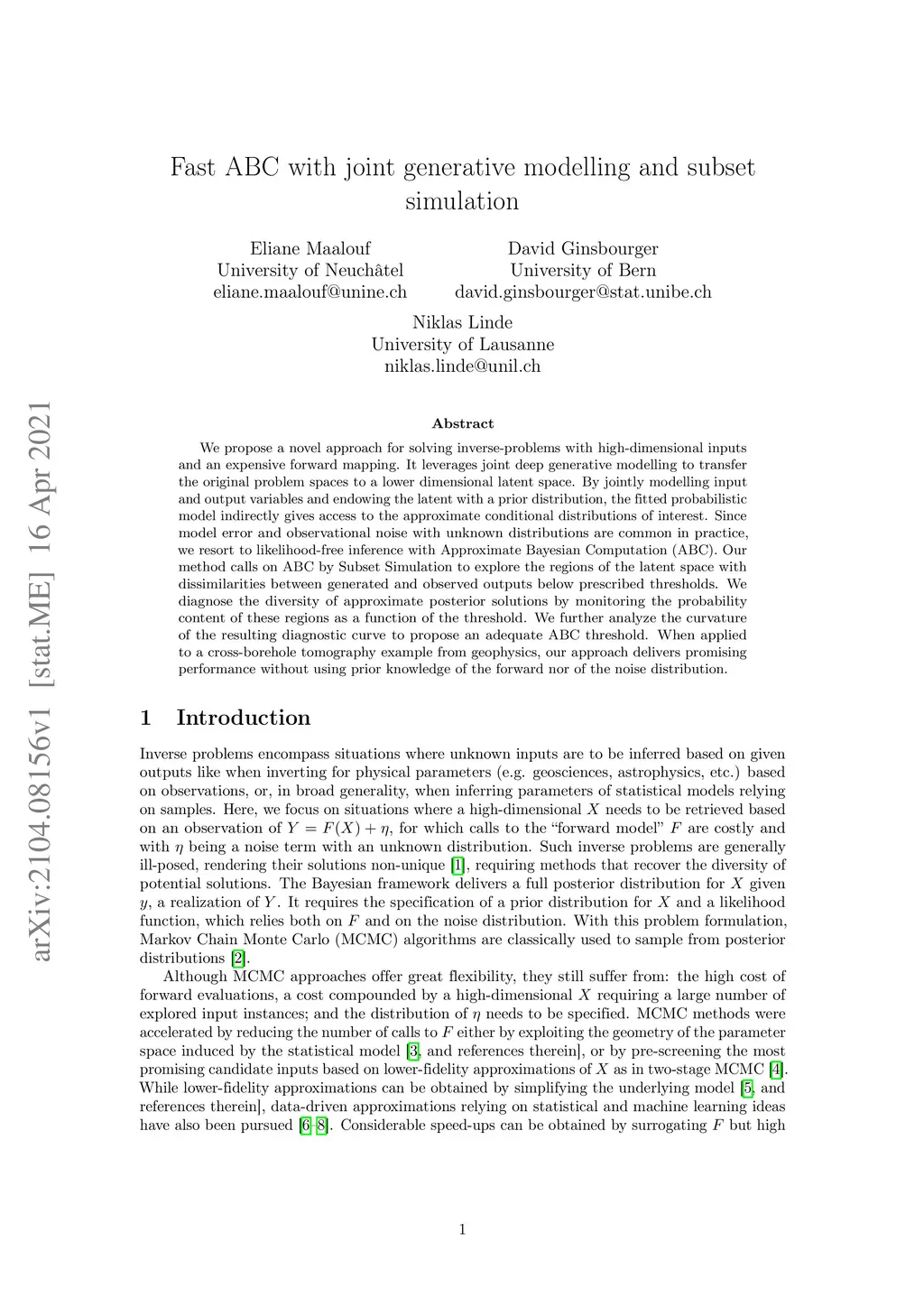 We propose a novel approach for solving inverse-problems with high-dimensional inputs and an expensive forward mapping. It leverages joint deep generative modelling to transfer the original problem spaces to a lower dimensional latent space. By jointly modelling input and output variables and endowing the latent with a prior distribution, the fitted probabilistic model indirectly gives access to the approximate conditional distributions of interest. Since model error and observational noise with unknown distributions are common in practice, we resort to likelihood-free inference with Approximate Bayesian Computation (ABC). Our method calls on ABC by Subset Simulation to explore the regions of the latent space with dissimilarities between generated and observed outputs below prescribed thresholds. We diagnose the diversity of approximate posterior solutions by monitoring the probability content of these regions as a function of the threshold. We further analyze the curvature of the resulting diagnostic curve to propose an adequate ABC threshold. When applied to a cross-borehole tomography example from geophysics, our approach delivers promising performance without using prior knowledge of the forward nor of the noise distribution.