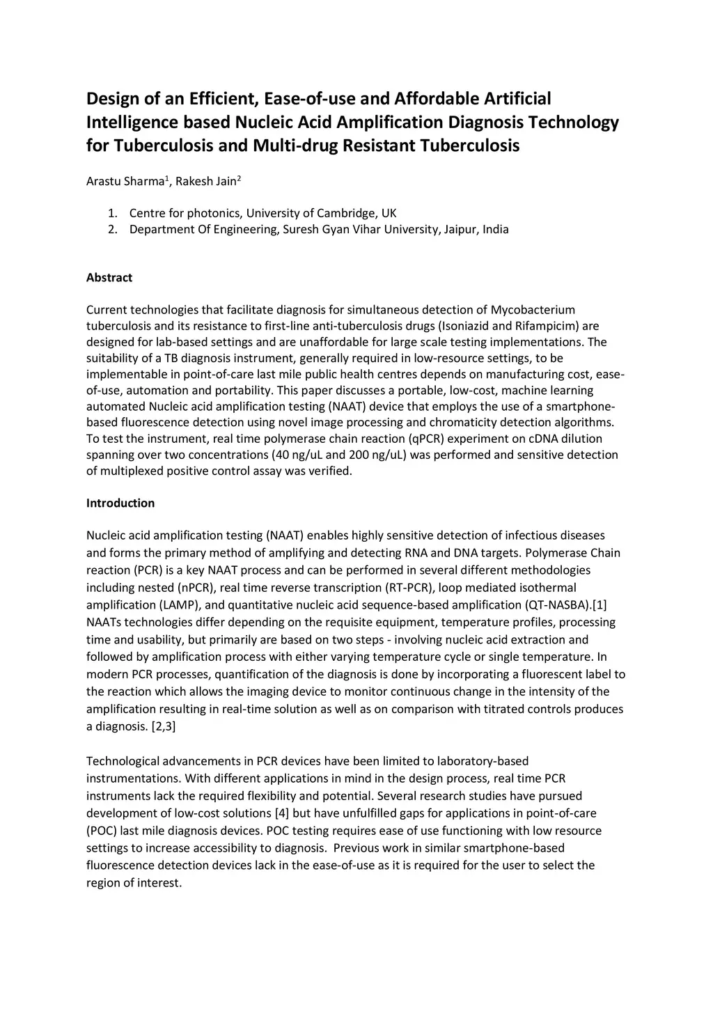 Current technologies that facilitate diagnosis for simultaneous detection of Mycobacterium tuberculosis and its resistance to first-line anti-tuberculosis drugs (Isoniazid and Rifampicim) are designed for lab-based settings and are unaffordable for large scale testing implementations. The suitability of a TB diagnosis instrument, generally required in low-resource settings, to be implementable in point-of-care last mile public health centres depends on manufacturing cost, ease-of-use, automation and portability. This paper discusses a portable, low-cost, machine learning automated Nucleic acid amplification testing (NAAT) device that employs the use of a smartphone-based fluorescence detection using novel image processing and chromaticity detection algorithms. To test the instrument, real time polymerase chain reaction (qPCR) experiment on cDNA dilution spanning over two concentrations (40 ng/uL and 200 ng/uL) was performed and sensitive detection of multiplexed positive control assay was verified.