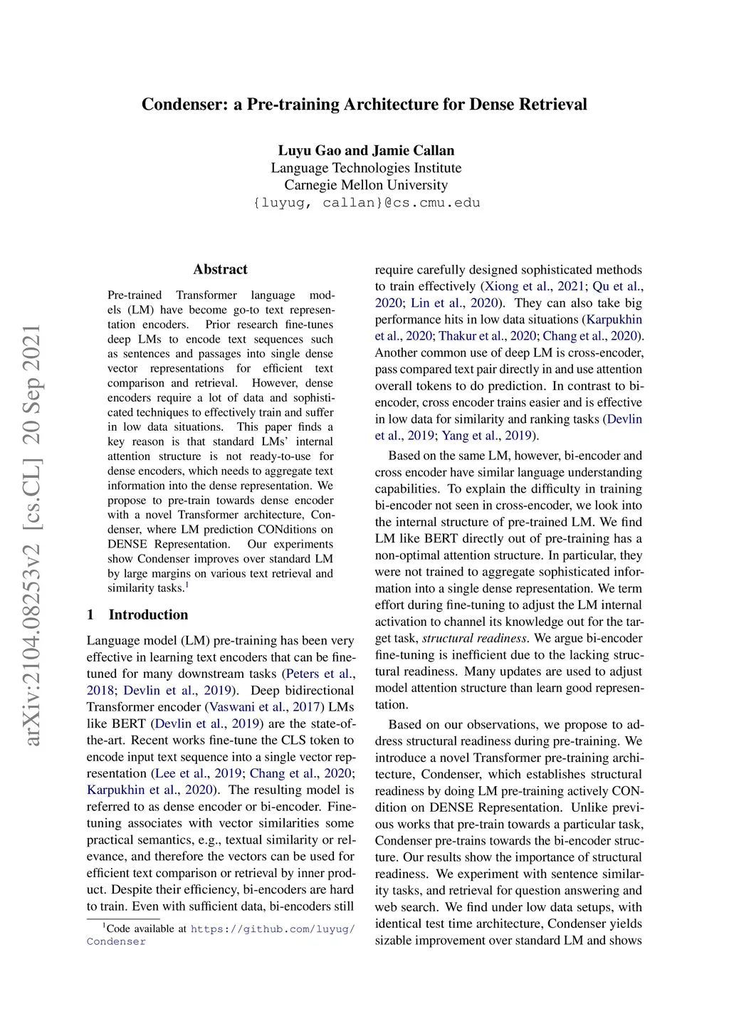 Condenser: a Pre-training Architecture for Dense Retrieval