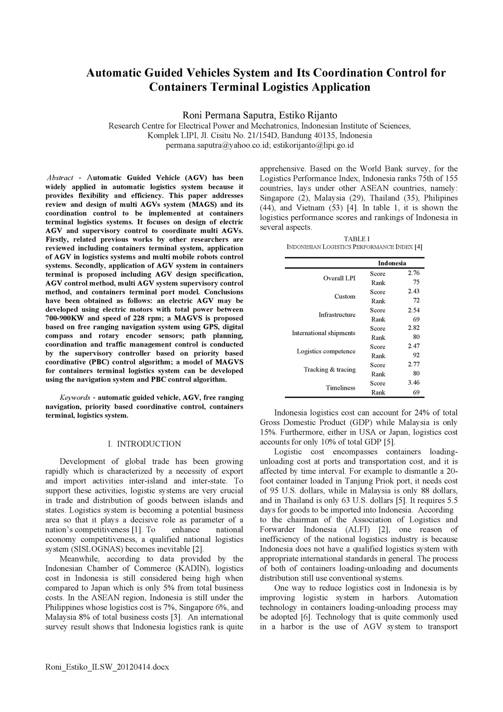Automatic Guided Vehicle (AGV) has been widely applied in automatic logistics system because it provides flexibility and efficiency. This paper addresses review and design of multi AGVs system (MAGS) and its coordination control to be implemented at containers terminal logistics systems. It focuses on design of electric AGV and supervisory control to coordinate multi AGVs. Firstly, related previous works by other researchers are reviewed including containers terminal system, application of AGV in logistics systems and multi mobile robots control systems. Secondly, application of AGV system in containers terminal is proposed including AGV design specification, AGV control method, multi AGV system supervisory control method, and containers terminal port model. Conclusions have been obtained as follows: an electric AGV may be developed using electric motors with total power between 700-900KW and speed of 228 rpm; a MAGVS is proposed based on free ranging navigation system using GPS, digital compass and rotary encoder sensors; path planning, coordination and traffic management control is conducted by the supervisory controller based on priority based coordinative (PBC) control algorithm; a model of MAGVS for containers terminal logistics system can be developed using the navigation system and PBC control algorithm.
