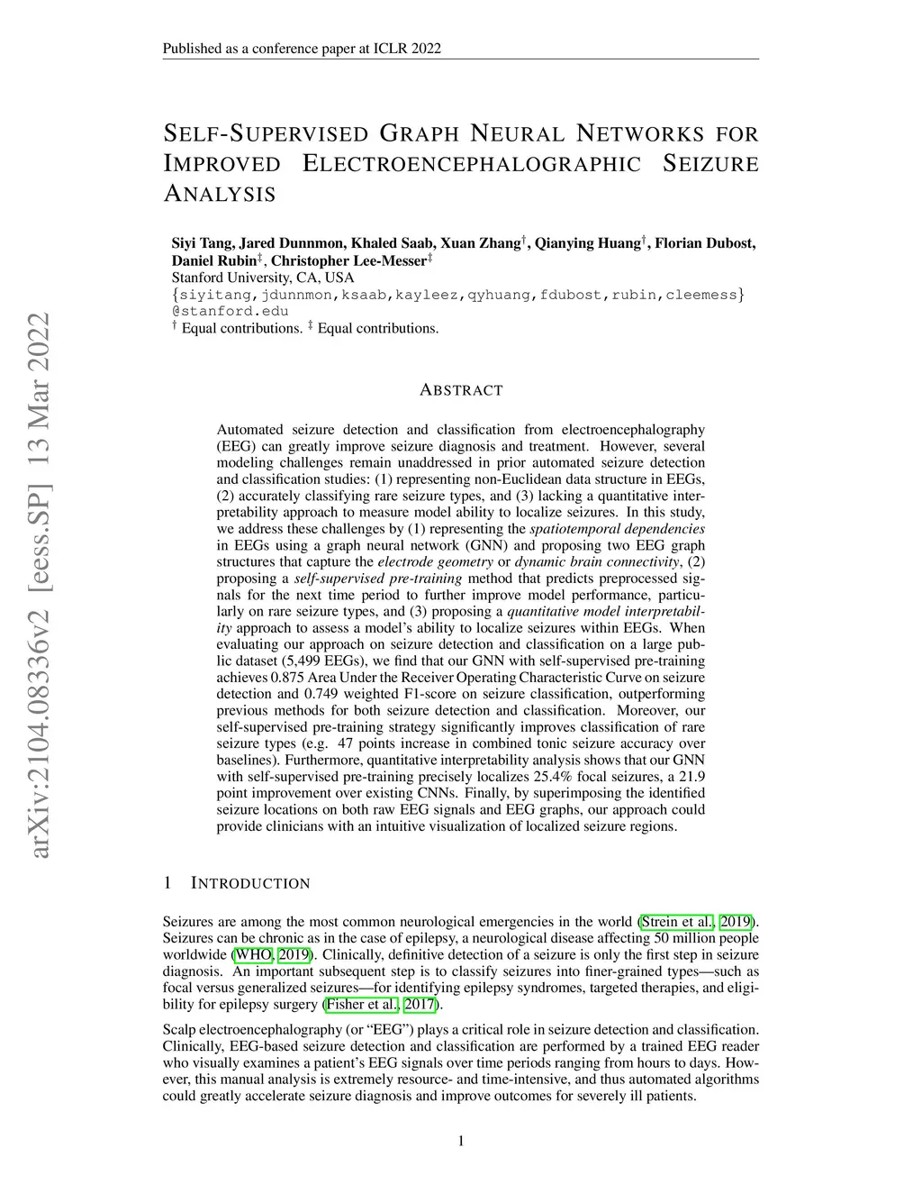 Automated seizure detection and classification from electroencephalography (EEG) can greatly improve seizure diagnosis and treatment. However, several modeling challenges remain unaddressed in prior automated seizure detection and classification studies: (1) representing non-Euclidean data structure in EEGs, (2) accurately classifying rare seizure types, and (3) lacking a quantitative interpretability approach to measure model ability to localize seizures. In this study, we address these challenges by (1) representing the spatiotemporal dependencies in EEGs using a graph neural network (GNN) and proposing two EEG graph structures that capture the electrode geometry or dynamic brain connectivity, (2) proposing a self-supervised pre-training method that predicts preprocessed signals for the next time period to further improve model performance, particularly on rare seizure types, and (3) proposing a quantitative model interpretability approach to assess a model's ability to localize seizures within EEGs. When evaluating our approach on seizure detection and classification on a large public dataset, we find that our GNN with self-supervised pre-training achieves 0.875 Area Under the Receiver Operating Characteristic Curve on seizure detection and 0.749 weighted F1-score on seizure classification, outperforming previous methods for both seizure detection and classification. Moreover, our self-supervised pre-training strategy significantly improves classification of rare seizure types. Furthermore, quantitative interpretability analysis shows that our GNN with self-supervised pre-training precisely localizes 25.4% focal seizures, a 21.9 point improvement over existing CNNs. Finally, by superimposing the identified seizure locations on both raw EEG signals and EEG graphs, our approach could provide clinicians with an intuitive visualization of localized seizure regions.