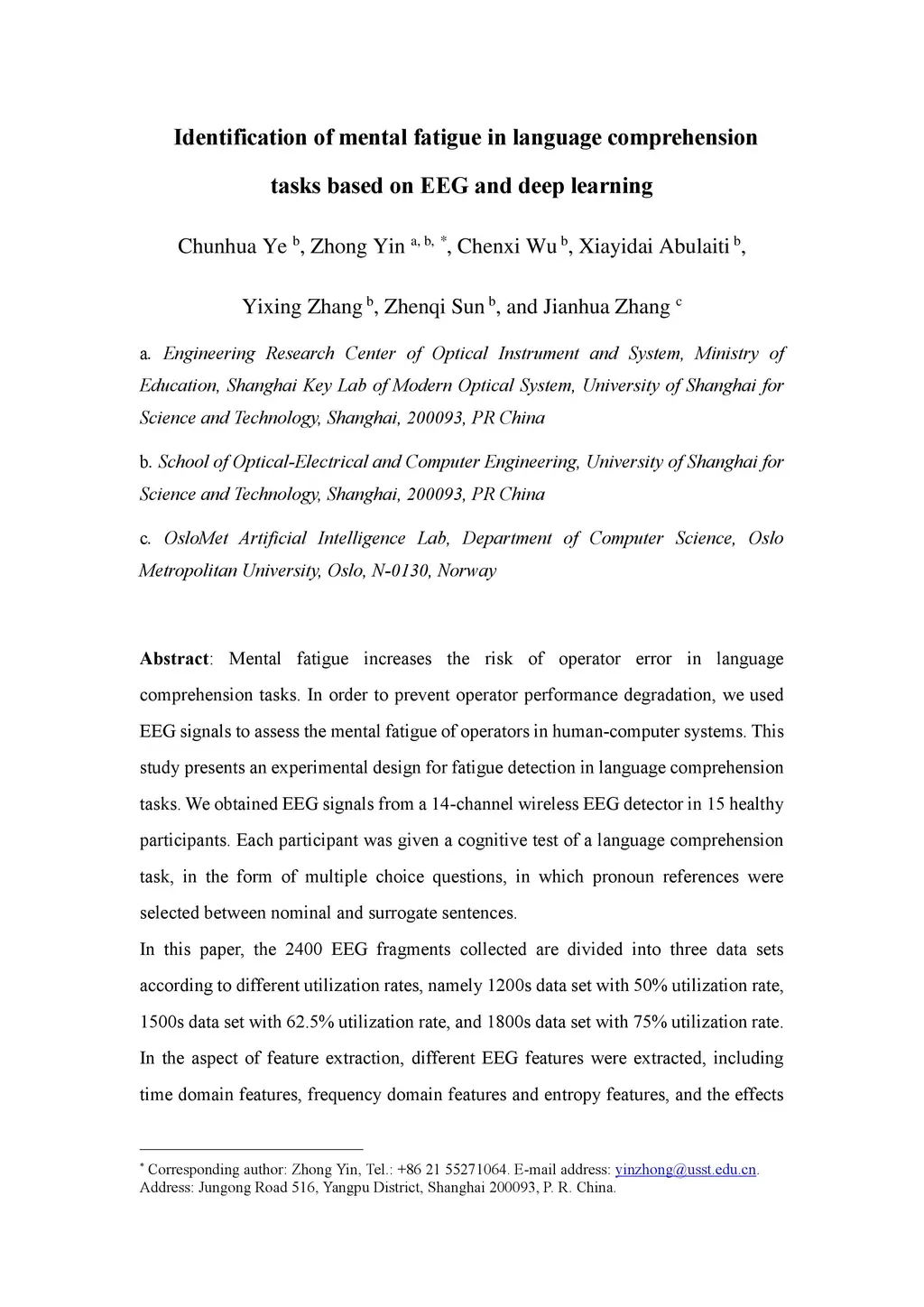 Mental fatigue increases the risk of operator error in language comprehension tasks. In order to prevent operator performance degradation, we used EEG signals to assess the mental fatigue of operators in human-computer systems. This study presents an experimental design for fatigue detection in language comprehension tasks. We obtained EEG signals from a 14-channel wireless EEG detector in 15 healthy participants. Each participant was given a cognitive test of a language comprehension task, in the form of multiple choice questions, in which pronoun references were selected between nominal and surrogate sentences. In this paper, the 2400 EEG fragments collected are divided into three data sets according to different utilization rates, namely 1200s data set with 50% utilization rate, 1500s data set with 62.5% utilization rate, and 1800s data set with 75% utilization rate. In the aspect of feature extraction, different EEG features were extracted, including time domain features, frequency domain features and entropy features, and the effects of different features and feature combinations on classification accuracy were explored. In terms of classification, we introduced the Convolutional Neural Network (CNN) method as the preferred method, It was compared with Least Squares Support Vector Machines(LSSVM),Support Vector Machines(SVM),Logistic Regression (LR), Random Forest(RF), Naive Bayes (NB), K-Nearest Neighbor (KNN) and Decision Tree(DT).According to the results, the classification accuracy of convolutional neural network (CNN) is higher than that of other classification methods. The classification results show that the classification accuracy of 1200S dataset is higher than the other two datasets. The combination of Frequency and entropy feature and CNN has the highest classification accuracy, which is 85.34%.