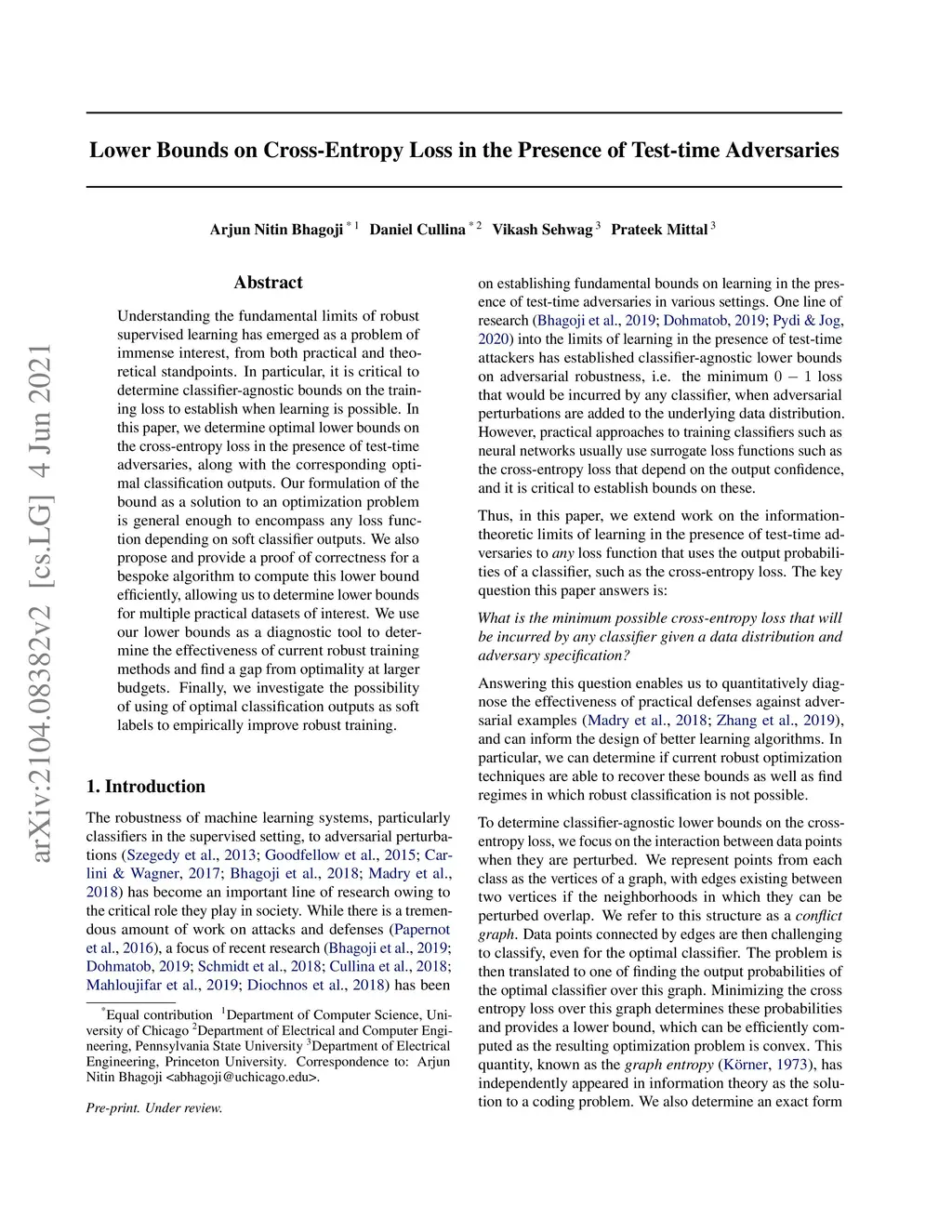 Understanding the fundamental limits of robust supervised learning has emerged as a problem of immense interest, from both practical and theoretical standpoints. In particular, it is critical to determine classifier-agnostic bounds on the training loss to establish when learning is possible. In this paper, we determine optimal lower bounds on the cross-entropy loss in the presence of test-time adversaries, along with the corresponding optimal classification outputs. Our formulation of the bound as a solution to an optimization problem is general enough to encompass any loss function depending on soft classifier outputs. We also propose and provide a proof of correctness for a bespoke algorithm to compute this lower bound efficiently, allowing us to determine lower bounds for multiple practical datasets of interest. We use our lower bounds as a diagnostic tool to determine the effectiveness of current robust training methods and find a gap from optimality at larger budgets. Finally, we investigate the possibility of using of optimal classification outputs as soft labels to empirically improve robust training.