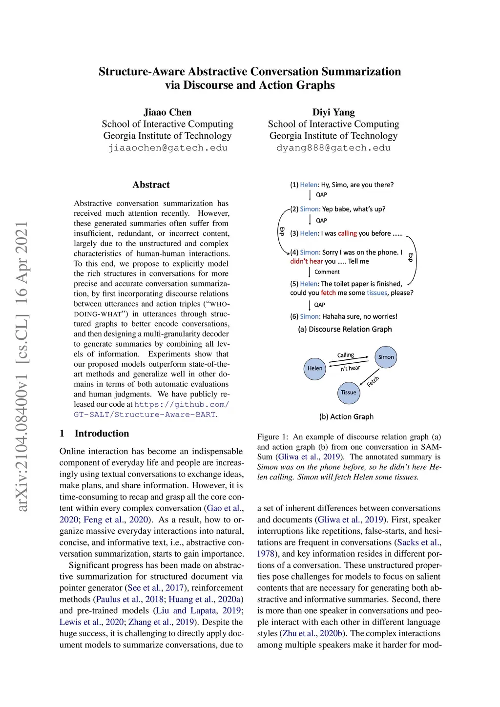 Abstractive conversation summarization has received much attention recently. However, these generated summaries often suffer from insufficient, redundant, or incorrect content, largely due to the unstructured and complex characteristics of human-human interactions. To this end, we propose to explicitly model the rich structures in conversations for more precise and accurate conversation summarization, by first incorporating discourse relations between utterances and action triples ("who-doing-what") in utterances through structured graphs to better encode conversations, and then designing a multi-granularity decoder to generate summaries by combining all levels of information. Experiments show that our proposed models outperform state-of-the-art methods and generalize well in other domains in terms of both automatic evaluations and human judgments. We have publicly released our code at https://github.com/GT-SALT/Structure-Aware-BART.