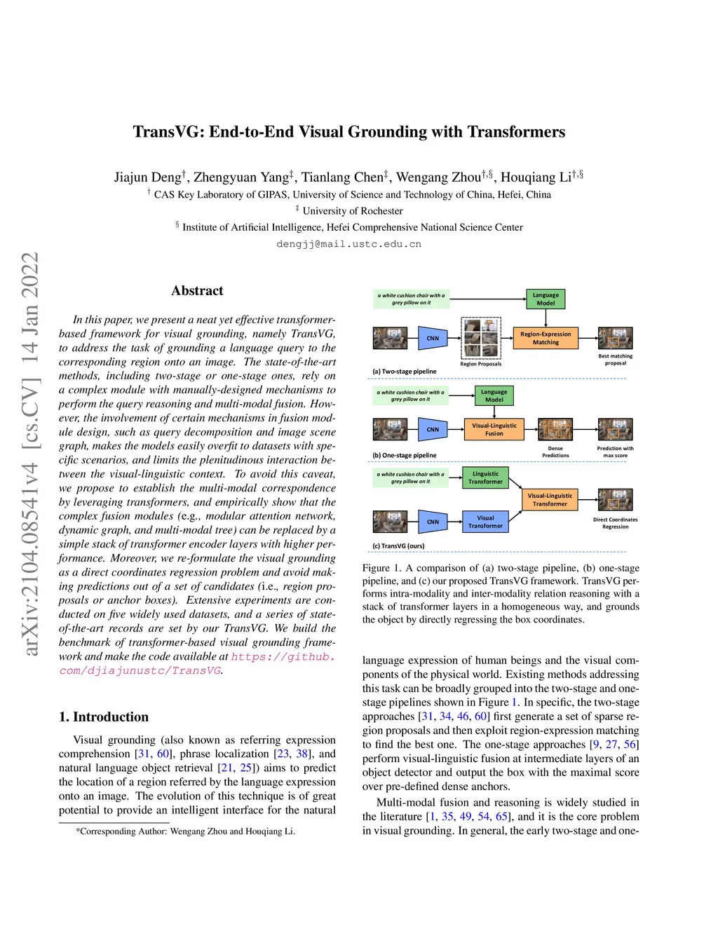 In this paper, we present a neat yet effective transformer-based framework for visual grounding, namely TransVG, to address the task of grounding a language query to the corresponding region onto an image. The state-of-the-art methods, including two-stage or one-stage ones, rely on a complex module with manually-designed mechanisms to perform the query reasoning and multi-modal fusion. However, the involvement of certain mechanisms in fusion module design, such as query decomposition and image scene graph, makes the models easily overfit to datasets with specific scenarios, and limits the plenitudinous interaction between the visual-linguistic context. To avoid this caveat, we propose to establish the multi-modal correspondence by leveraging transformers, and empirically show that the complex fusion modules e.g., modular attention network, dynamic graph, and multi-modal tree) can be replaced by a simple stack of transformer encoder layers with higher performance. Moreover, we re-formulate the visual grounding as a direct coordinates regression problem and avoid making predictions out of a set of candidates i.e., region proposals or anchor boxes). Extensive experiments are conducted on five widely used datasets, and a series of state-of-the-art records are set by our TransVG. We build the benchmark of transformer-based visual grounding framework and make the code available at \url{https://github.com/djiajunustc/TransVG}.