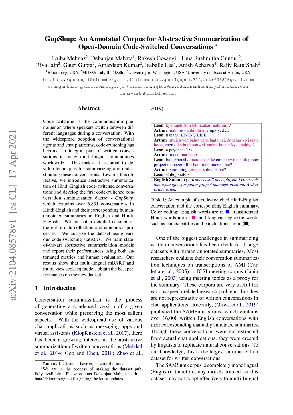 Code-switching is the communication phenomenon where speakers switch between different languages during a conversation. With the widespread adoption of conversational agents and chat platforms, code-switching has become an integral part of written conversations in many multi-lingual communities worldwide. This makes it essential to develop techniques for summarizing and understanding these conversations. Towards this objective, we introduce abstractive summarization of Hindi-English code-switched conversations and develop the first code-switched conversation summarization dataset - GupShup, which contains over 6,831 conversations in Hindi-English and their corresponding human-annotated summaries in English and Hindi-English. We present a detailed account of the entire data collection and annotation processes. We analyze the dataset using various code-switching statistics. We train state-of-the-art abstractive summarization models and report their performances using both automated metrics and human evaluation. Our results show that multi-lingual mBART and multi-view seq2seq models obtain the best performances on the new dataset