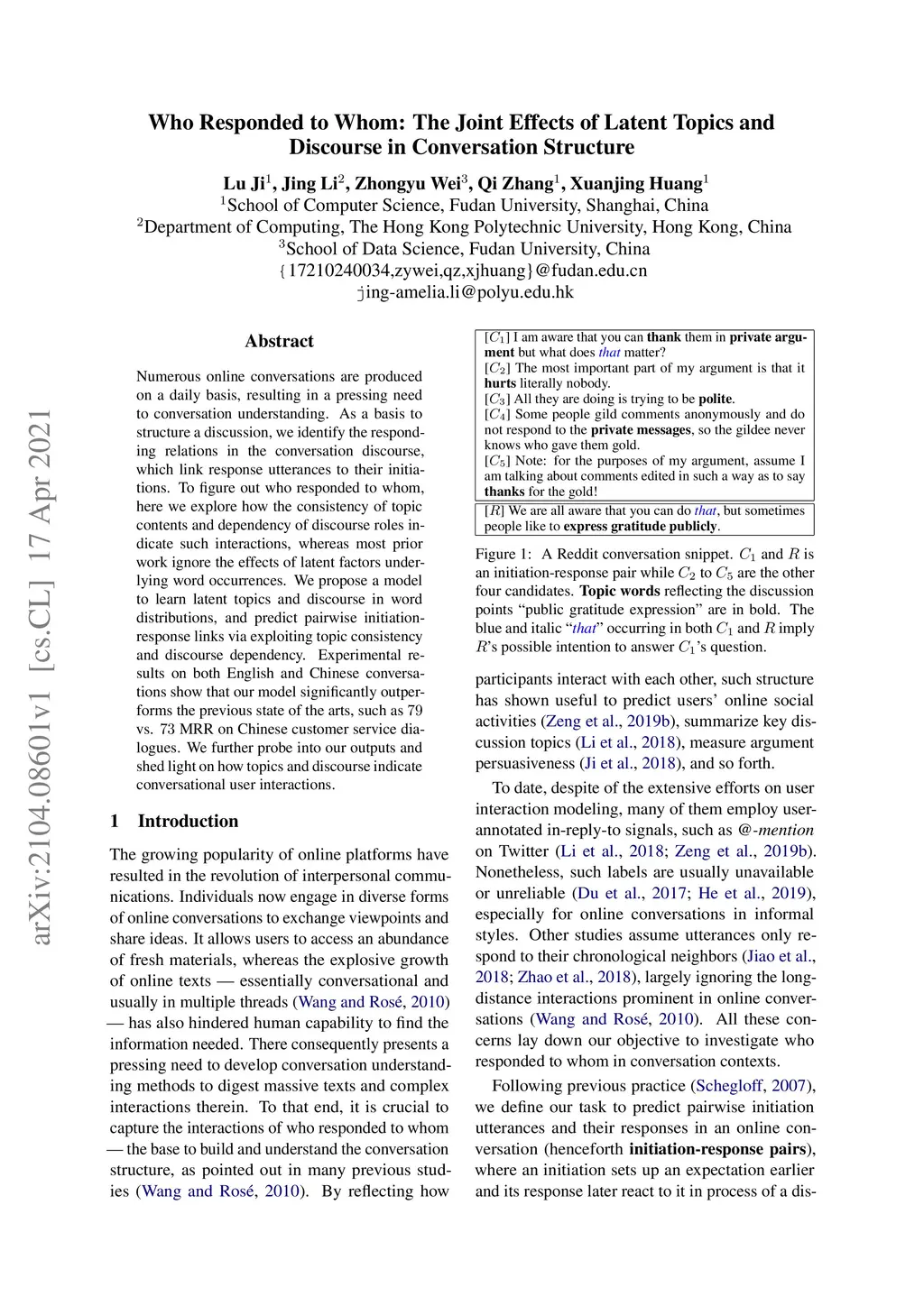 Who Responded to Whom: The Joint Effects of Latent Topics and Discourse