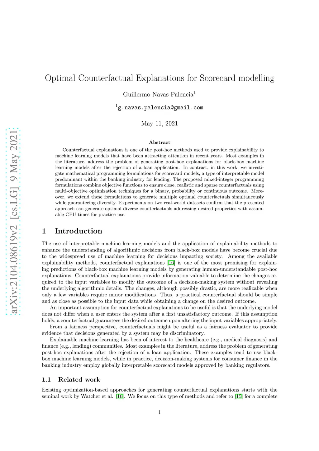 Counterfactual explanations is one of the post-hoc methods used to provide explainability to machine learning models that have been attracting attention in recent years. Most examples in the literature, address the problem of generating post-hoc explanations for black-box machine learning models after the rejection of a loan application. In contrast, in this work, we investigate mathematical programming formulations for scorecard models, a type of interpretable model predominant within the banking industry for lending. The proposed mixed-integer programming formulations combine objective functions to ensure close, realistic and sparse counterfactuals using multi-objective optimization techniques for a binary, probability or continuous outcome. Moreover, we extend these formulations to generate multiple optimal counterfactuals simultaneously while guaranteeing diversity. Experiments on two real-world datasets confirm that the presented approach can generate optimal diverse counterfactuals addressing desired properties with assumable CPU times for practice use.