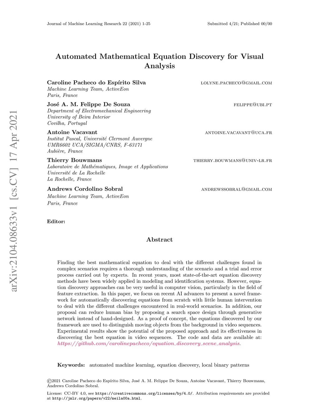 Finding the best mathematical equation to deal with the different challenges found in complex scenarios requires a thorough understanding of the scenario and a trial and error process carried out by experts. In recent years, most state-of-the-art equation discovery methods have been widely applied in modeling and identification systems. However, equation discovery approaches can be very useful in computer vision, particularly in the field of feature extraction. In this paper, we focus on recent AI advances to present a novel framework for automatically discovering equations from scratch with little human intervention to deal with the different challenges encountered in real-world scenarios. In addition, our proposal can reduce human bias by proposing a search space design through generative network instead of hand-designed. As a proof of concept, the equations discovered by our framework are used to distinguish moving objects from the background in video sequences. Experimental results show the potential of the proposed approach and its effectiveness in discovering the best equation in video sequences. The code and data are available at: https://github.com/carolinepacheco/equation-discovery-scene-analysis