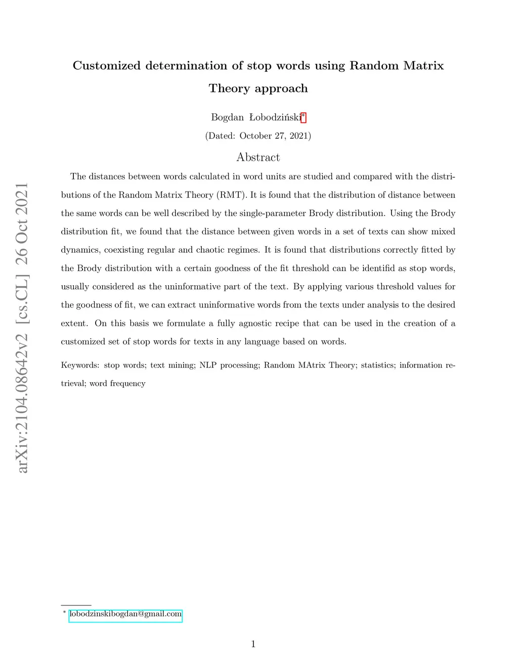 The distances between words calculated in word units are studied and compared with the distributions of the Random Matrix Theory (RMT). It is found that the distribution of distance between the same words can be well described by the single-parameter Brody distribution. Using the Brody distribution fit, we found that the distance between given words in a set of texts can show mixed dynamics, coexisting regular and chaotic regimes. It is found that distributions correctly fitted by the Brody distribution with a certain goodness of the fit threshold can be identifid as stop words, usually considered as the uninformative part of the text. By applying various threshold values for the goodness of fit, we can extract uninformative words from the texts under analysis to the desired extent. On this basis we formulate a fully agnostic recipe that can be used in the creation of a customized set of stop words for texts in any language based on words.