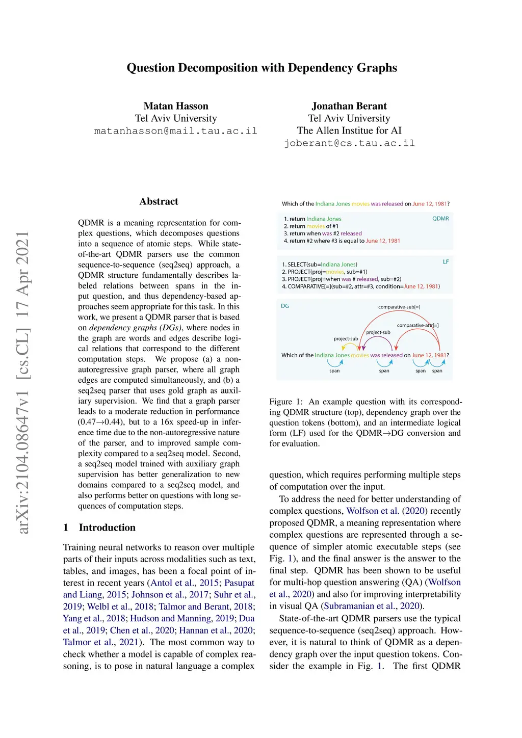 QDMR is a meaning representation for complex questions, which decomposes questions into a sequence of atomic steps. While state-of-the-art QDMR parsers use the common sequence-to-sequence (seq2seq) approach, a QDMR structure fundamentally describes labeled relations between spans in the input question, and thus dependency-based approaches seem appropriate for this task. In this work, we present a QDMR parser that is based on dependency graphs (DGs), where nodes in the graph are words and edges describe logical relations that correspond to the different computation steps. We propose (a) a non-autoregressive graph parser, where all graph edges are computed simultaneously, and (b) a seq2seq parser that uses gold graph as auxiliary supervision. We find that a graph parser leads to a moderate reduction in performance (0.47 to 0.44), but to a 16x speed-up in inference time due to the non-autoregressive nature of the parser, and to improved sample complexity compared to a seq2seq model. Second, a seq2seq model trained with auxiliary graph supervision has better generalization to new domains compared to a seq2seq model, and also performs better on questions with long sequences of computation steps.