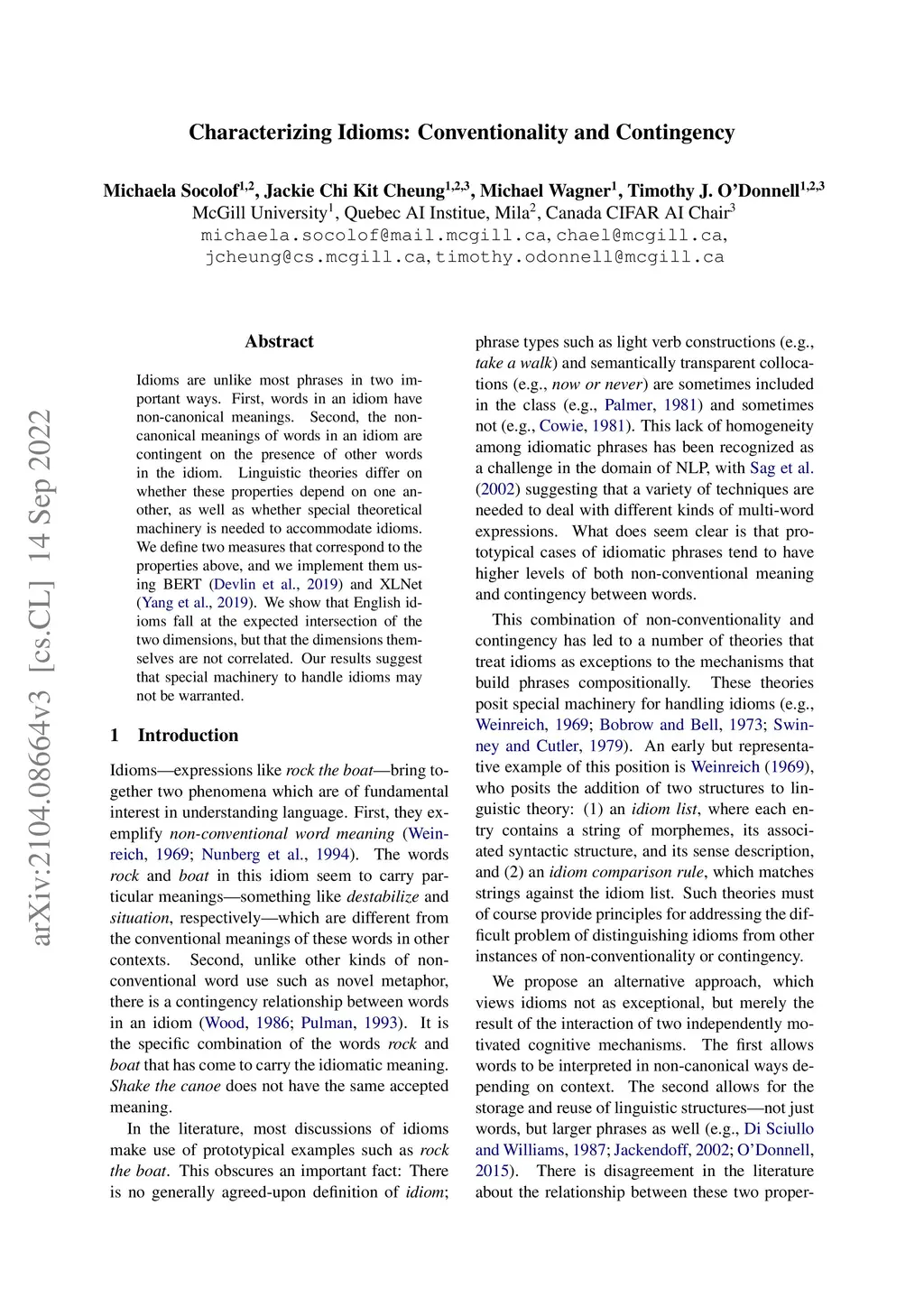 Idioms are unlike most phrases in two important ways. First, the words in an idiom have non-canonical meanings. Second, the non-canonical meanings of words in an idiom are contingent on the presence of other words in the idiom. Linguistic theories differ on whether these properties depend on one another, as well as whether special theoretical machinery is needed to accommodate idioms. We define two measures that correspond to the properties above, and we implement them using BERT (Devlin et al., 2019) and XLNet(Yang et al., 2019). We show that idioms fall at the expected intersection of the two dimensions, but that the dimensions themselves are not correlated. Our results suggest that special machinery to handle idioms may not be warranted.