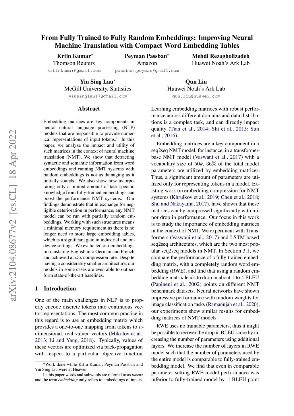 Embedding matrices are key components in neural natural language processing (NLP) models that are responsible to provide numerical representations of input tokens.\footnote{In this paper words and subwords are referred to as \textit{tokens} and the term \textit{embedding} only refers to embeddings of inputs.} In this paper, we analyze the impact and utility of such matrices in the context of neural machine translation (NMT). We show that detracting syntactic and semantic information from word embeddings and running NMT systems with random embeddings is not as damaging as it initially sounds. We also show how incorporating only a limited amount of task-specific knowledge from fully-trained embeddings can boost the performance NMT systems. Our findings demonstrate that in exchange for negligible deterioration in performance, any NMT model can be run with partially random embeddings. Working with such structures means a minimal memory requirement as there is no longer need to store large embedding tables, which is a significant gain in industrial and on-device settings. We evaluated our embeddings in translating {English} into {German} and {French} and achieved a x compression rate. Despite having a considerably smaller architecture, our models in some cases are even able to outperform state-of-the-art baselines.