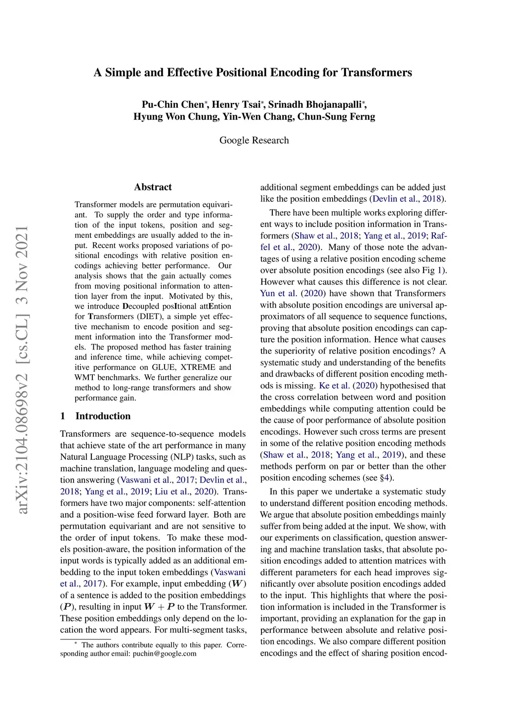 Transformer models are permutation equivariant. To supply the order and type information of the input tokens, position and segment embeddings are usually added to the input. Recent works proposed variations of positional encodings with relative position encodings achieving better performance. Our analysis shows that the gain actually comes from moving positional information to attention layer from the input. Motivated by this, we introduce Decoupled Positional Attention for Transformers (DIET), a simple yet effective mechanism to encode position and segment information into the Transformer models. The proposed method has faster training and inference time, while achieving competitive performance on GLUE, XTREME and WMT benchmarks. We further generalize our method to long-range transformers and show performance gain.